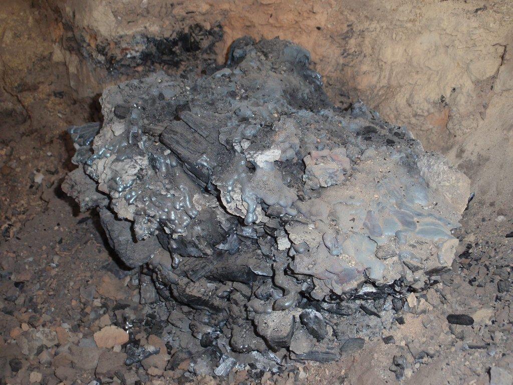 After completing of the first smelt at about 8:00 pm the proper charge started to be loaded into the natural draught furnace. Two batches of ore weighing approximately 15kg were loaded into the furnace with alternating layers of charcoal, and a significant decrease of temperature was observed in the level of tuyère. Although the level of charge declined, it was not possible to increase the temperature - even despite the temporary use of bellows. In that circumstance it was decided not to continue feeding the furnace and to terminate the process at approx. 2.00 am on 6 October (Sunday). However, after returning to the experiment later that morning it was found that there were clear traces of furnace bricks firing at the level of blast. After the shaft demolition it turned out that all of the charge which passed through the shaft to the upper part of the slag-pit had begun to create a slag block. After more observation it was evident that the beginnings of iron formation was evident on its surface therefore it was concluded that the experiment should be repeated during the next seminar scheduled for the spring of 2014. The cessation of furnace work can be explained presumably by the natural changes in atmospheric pressure conditions, a conclusion which became more favorable shortly after the abandonment of the experiment. The material from the natural draught furnace has been taken for further analysis, which hopefully will result in better conclusion/processes/experiments/hypotheses in the near future.