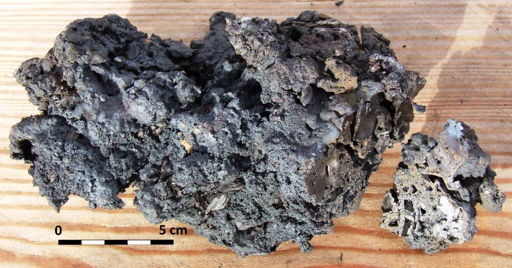 To begin with the air flow was applied only through the one hole. Subsequently during the second phase the other hole was also used. 40,6 kg (89 lbs) of ore and approx. 50kg (110 lbs) of charcoal was used during over the 6 hours of furnace working. After that time, at 7:30 pm, the shaft was disassembled and the iron bloom extracted. Next, a still hot bloom was processed and compacted. The total yield amounted to 3,65 kg (8 lbs) of iron, 3kg (6,6 lbs) of which in form of pure and slag-free metal. The slag block documented and extracted from the slag-pit had a weight of approx. 40 kg (88 lbs). Observations made during and after the process indicate that could have been conducted for much longer in order to complete filling the slag-pit and joining whole slag in one solid block. This would also have resulted in a greater yield of iron bloom. The most important fact observed here was the complete separation of iron from the slag block, which seems to correspond with the effects achieved by the ancient smelters.