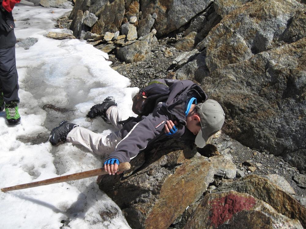 This participant was interviewed directly at the location at which the mummy was found. With very little experience in mountaineering, he had accompanied some vague acquaintances in order to reach the location of Ătziâs discovery. He found the path to be especially difficult and was very proud that he had finally made it. Based on his experiences, he develops an interpretation of the circumstances of Ătziâs death. He does not differentiate between his own abilities and emotional needs, and those he assumes Ătzi had and experienced. He projects his perception of a hostile environment in which he would not have wanted to be alone, onto a historical personality and thus, initiates a construction of history. Others even try to reenact the position in which Ătzi was found (See Figure 3).