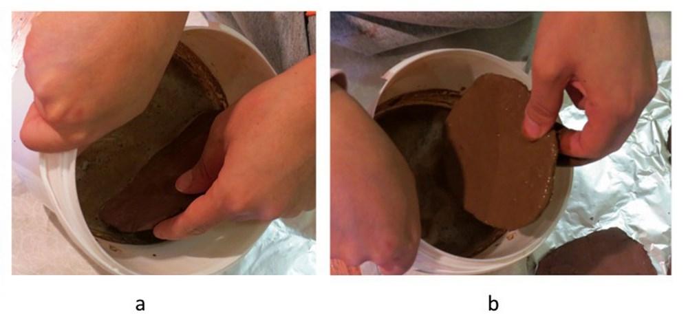 In Dalma ware, the buff slip was applied to the whole vessel before the inside surface was double-slipped. In the outline of this project, two alternative methods were suggested for applying the buff or light colour slip. The first one was to dip the pottery in the slip, which helps the slip to spread uniformly. The second method was to apply the slip with a cloth. I decided to limit the project to dipping because this method is more efficient when the slip is applied to the whole body. In addition, as the slip on Dalma pottery in the sample was uniform, it would correlate better with dipping technique. The second method is also more time-consuming, so it sounded less feasible for this experiment. Finally, this stage of pottery production would not directly affect the project’s research question. According to Rye (1981, 41), with the dipping method, the slip should be applied when the clay is not completely dry, because the slip splits easily from the dry surface; in the experiment I applied the slip when the clay was still leather-hard. I submerged the leather-hard slabs in a container of light colour slip, and allowed them to dry before applying the second, darker red slip (See Figure 5).