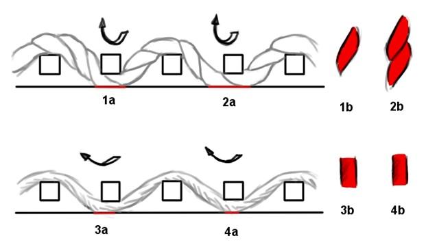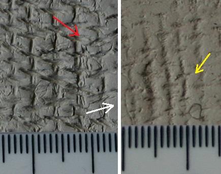 Firstly, plied yarns can be distinguished from single threads from these impressions, as the extra twist on these yarns create a slanted impression that is distinct from the single threadsâ impression, which lies straight, as shown in figure 6.