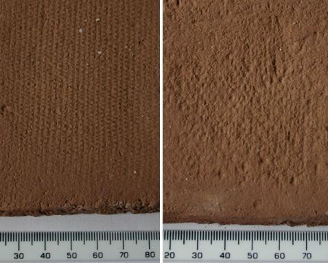 Lastly, the overall impressions formed by the finely spun and tightly woven linen fabrics on the natural Devon clay were smoother and more visible than those produced by woollen fabrics woven in the same way. Though details of the spinning were lost, the thread count and the weaving style can be established. Clearly, the smoothness of the linen fibres allowed the fabricâs structure to be well-imprinted on the clay. Should further details have been added (such as embroidery on the fabricâs surface), this author believes they would be imprinted with equal clarity. In comparison, the woollen impressions are either barely visible or do not have as much detail and precision as the linen, see figure 8 for a comparison of the impressions. The tightness of the woollen fabrics appears to have prevented the fabric from being pushed into the clay in the same manner as the linen fabrics, resulting in an impression of lower quality. Although this is a minor difference, it would allow for identification of potential plant fibre fabrics or woollen fabrics, as long as the ceramic impressions are not damaged.