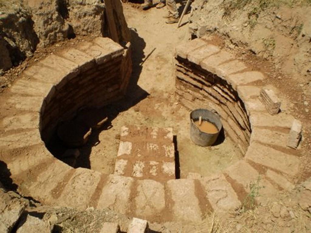 Toward the middle of June 2012, the external cracks were sealed with sifted earth diluted in water. The chamber was partially backfilled with earth to assure stability to the structure and prevent damage from contraction and dilatation. This process required erecting another row of bricks above praefurnium to contain the earth. In addition, all the cracks of the upper firing chamber were sealed, the work area at the mouth was cleaned, and wooden stairs were constructed leading to the door. In addition, a stone mortar bound wall was raised to each side of the door that served to contain the backfill.