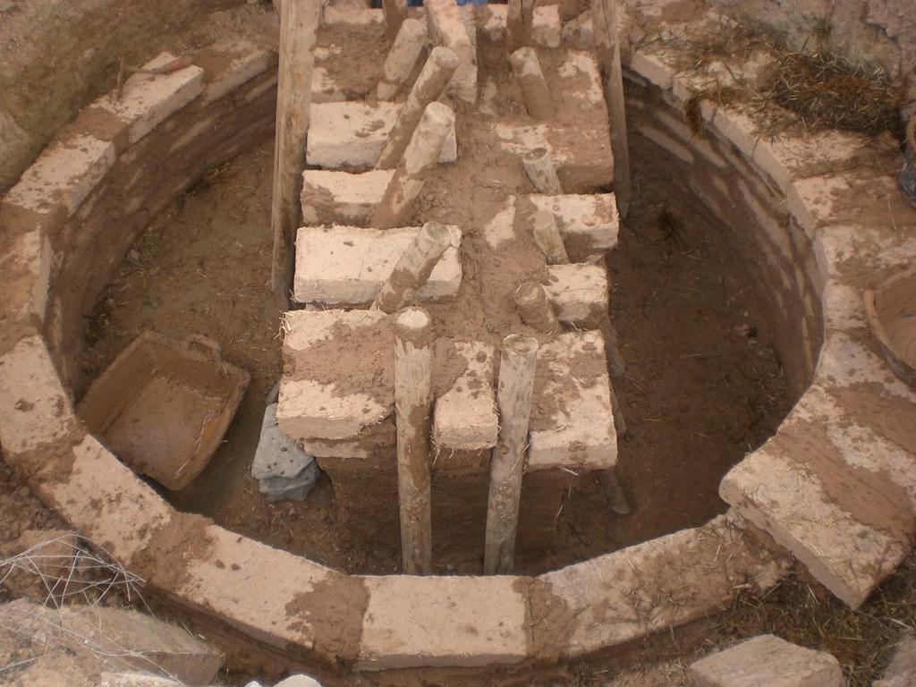 The building of the experimental kiln began in 2007. The first step was to dig a circular pit (3.5 m in diameter and 1.8 m deep) with a backhoe, following the model of the Alcalá de Júcar kiln.The lower combustion chamber was therefore below ground level and had a slightly inclined base, following the surface of the bedrock, and was oriented toward the West, protected from the local dominant winds.A ramp was builtto access the chamber. This was followed by building the kiln's perimeter wall with 236 bricks measuring 48 x 24 x 9 cm distributed in ten rows of 17 bricks each and two rows of 33 bricks (See Figure 8).