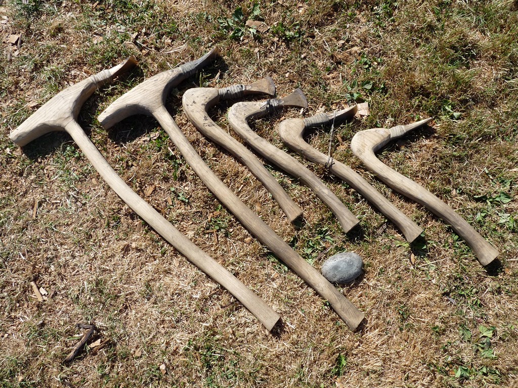The boat would be built using replicas of bronze Sheilv pattern Palstave blades. They were exact copies of an archaeological find from the Meon Valley. The Bronze Age marks the height of prehistoric log boat construction with the largest and most complex examples coming from this time period (McGrail, 2004, 174). Over all, six tools were made for use during the experiment; two short handled axes, two short handled adzes and two long handled adzes (See Figure 2). This set of tools with blades mounted as both axes and adzes would be sufficient to carry out all the work needed in building the logboat.