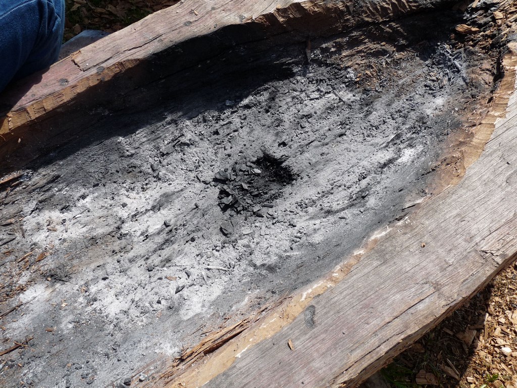 The burning process penetrated further through the wood than the visible sign of charring. It appears that the heat helps to loosen the wood further down than the visible evidence so when chipping away it was easier to use the tools to remove the un-burnt wood underlying the charred areas.