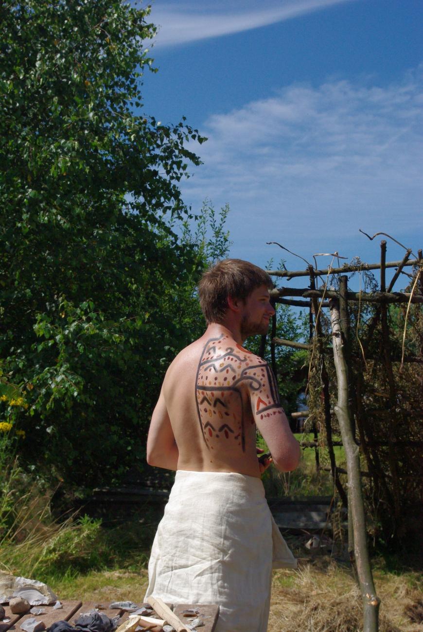 The performances, experiments et cetera. were then realised in the practical archaeological week in Albersdorf, where the students worked during the day at the Stone Age Village or in a school nearby. All of the reconstructed houses as well as the Mesolithic huts were used as sleeping spaces this year. Students stayed some of the evenings at the Stone Age Village to continue their projects, even when official work time was over and the public had left. To be recognisable for the visitors and for various other reasons all participants in the practical week – students and teachers alike – were dressed in linen, woollen or leather clothing. The patterns were inspired by and transferred from Neolithic and Bronze Age idols/figurines/illustrations and burial finds from a central European context. Due to the results from previous experimental work more leather clothes and coloured textiles could be seen on the participants during the practical archaeological week.