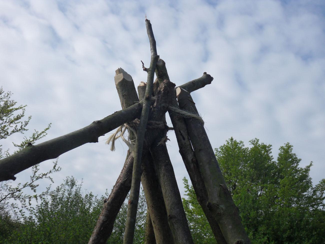 Both huts are about four metres high at their highest point. The walls are conical, tapered to a point on the small hut and oval on the big hut. A smoke hole on the top leads the smoke out of the hut. The roof was constructed by setting long arm-thick, green birch (Betula spec., Germ: Birke) branches vertically in holes on the perimeter. They were then bent to join at the top and bound together. Horizontal thumb thick sticks from buckthorn (Frangula alnus, Germ: Faulbaum) were added all around in a grid fashion. This gave the construction a very stable design.