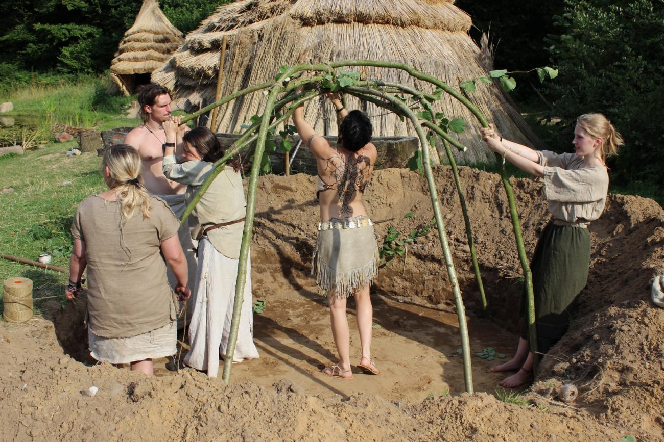 Every year the week has a special theme. In 2014 the topic was âDaily Life and Feastsâ, but not every group was able to transfer this into their projects. For example, some of the students mainly repaired broken objects (the clay oven, for the third time) or conserved things (raw hides, bark) for future use. Utilising archaeological evidence was essential for all groups and topics, which is sometimes a limitation to realising of ideas. By combining findings from different geographical and cultural regions, good results were achieved nonetheless. The idea of âfeastingâ was transformed in experiments to include musical objects, and the ongoing experimental brewing. The joint project of the construction of a sweat lodge was finished by the last day. The finishing touches and first experimental use of this building were carried out by the museums staff, but it is planned to return with some of the students in November 2014 to have also a first go.