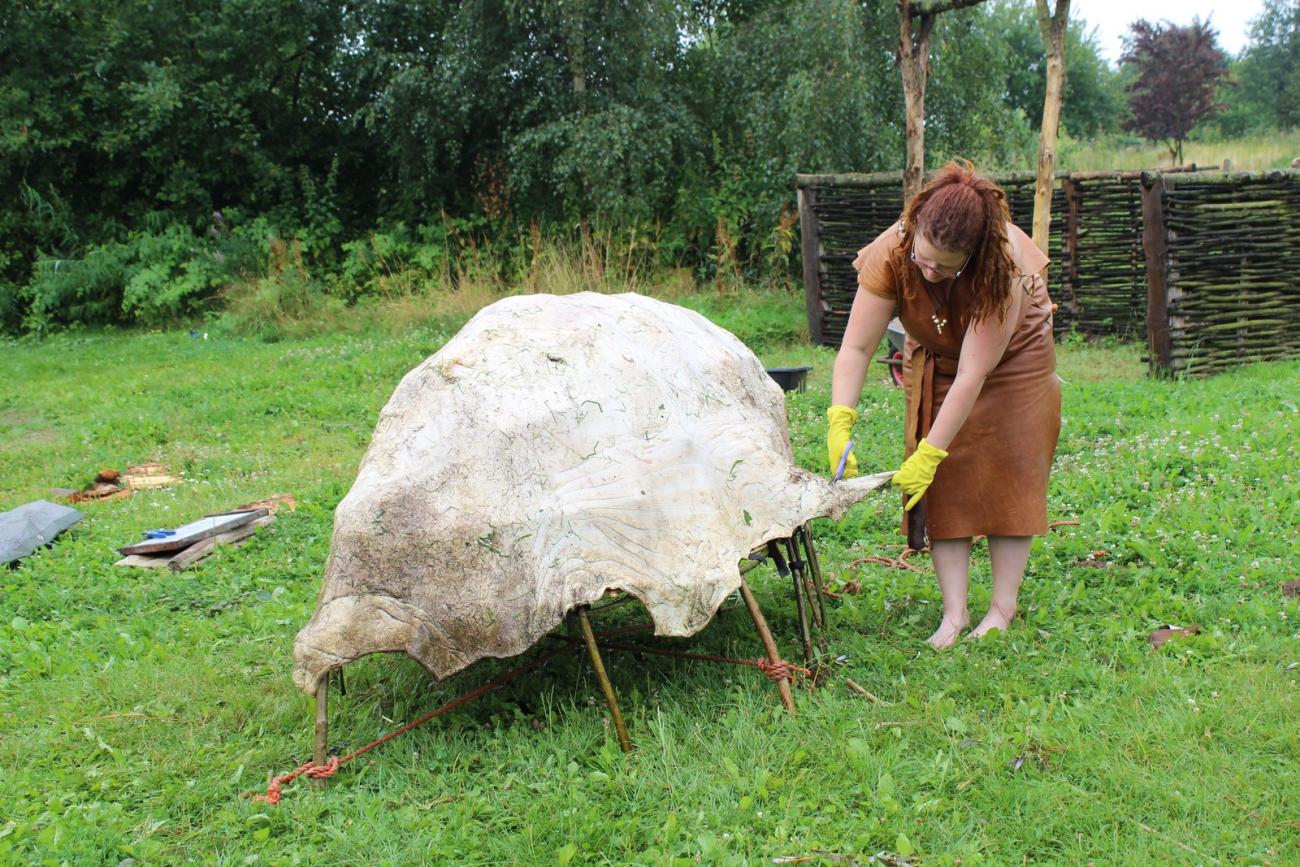 - Leather. Two deer hides were pulped and scraped by using different lithic tools like those often found within Neolithic habitation sites, but bone scrapers, like those used by the indigenous inhabitants of North America, were also used. It was considered that tools of this material may be found in archaeological contexts, but not recognised due to perhaps resembling waste. The hides were preserved in salt to (re-)use them next year for ongoing tanning experiments.