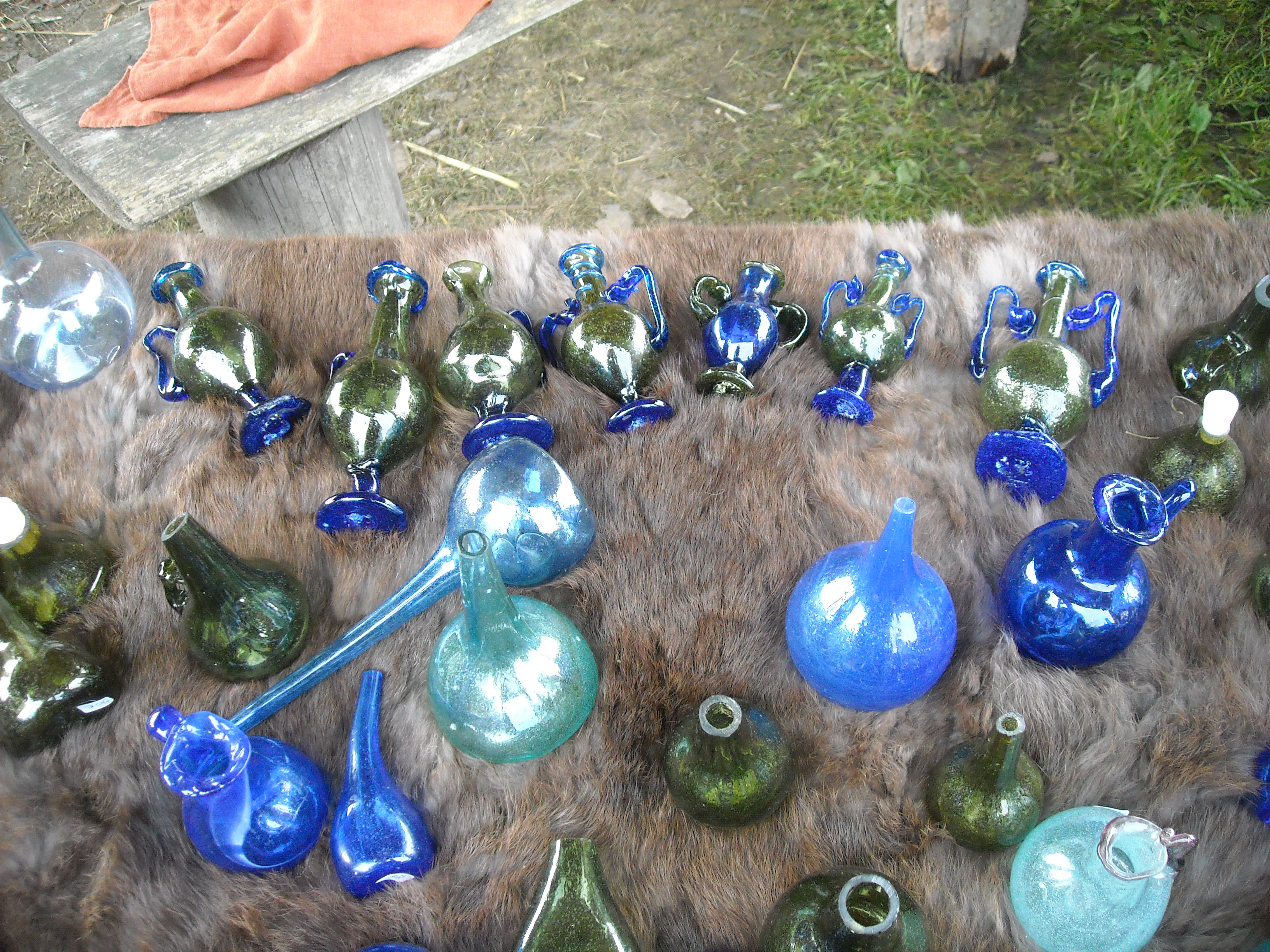 A glass batch similar to that used in December was employed (with the addition of copper and lead). The aim was to produce red (ruby-coloured) glass. The glass mass was easily workable, but the colour turned out to be problematic. The glass was partly red, but mostly green or copper-coloured. Nevertheless, we were able to manufacture very usable glass vessels, some of them with handles (See Figure 10). Early glass analyses carried out by Vienna University showed that fluorite remained in our glass. We had hoped that the fluorite would dissolve, as it did not occur in any of Wedepohl’s analyses of ancient glass.
