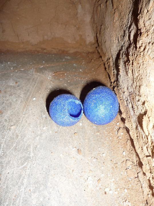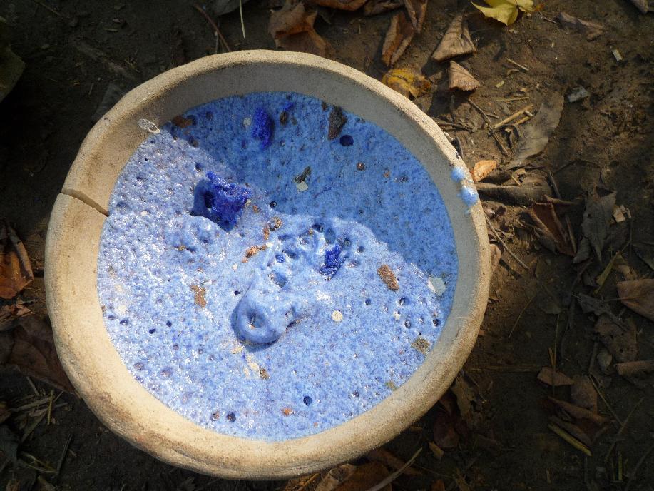 The most important insight from this experiment was that the small oven functioned considerably better than the large furnace. The high temperatures, which the large furnace can reach with the help of the chimney are not useable, as the furnace would then melt and destroy itself. The furnace wall, which consists of clay and mud bricks, melts away at 1250°C or more like ice in the sun. Fritting also turned out to be unnecessary. We were able to produce a homogenous glass mass without going through the fritting stage. The glass batch melted, but did not become sufficiently homogenous. Another problem was the distortion of the crucible due to the high temperatures.