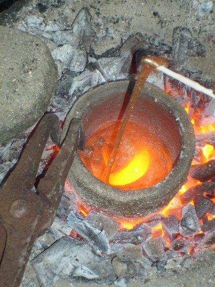 As no commercial crucibles suitable for the furnace were available, we made our own of fireproof clay, which was first baked, then crushed and mixed with 50% potters’ clay.