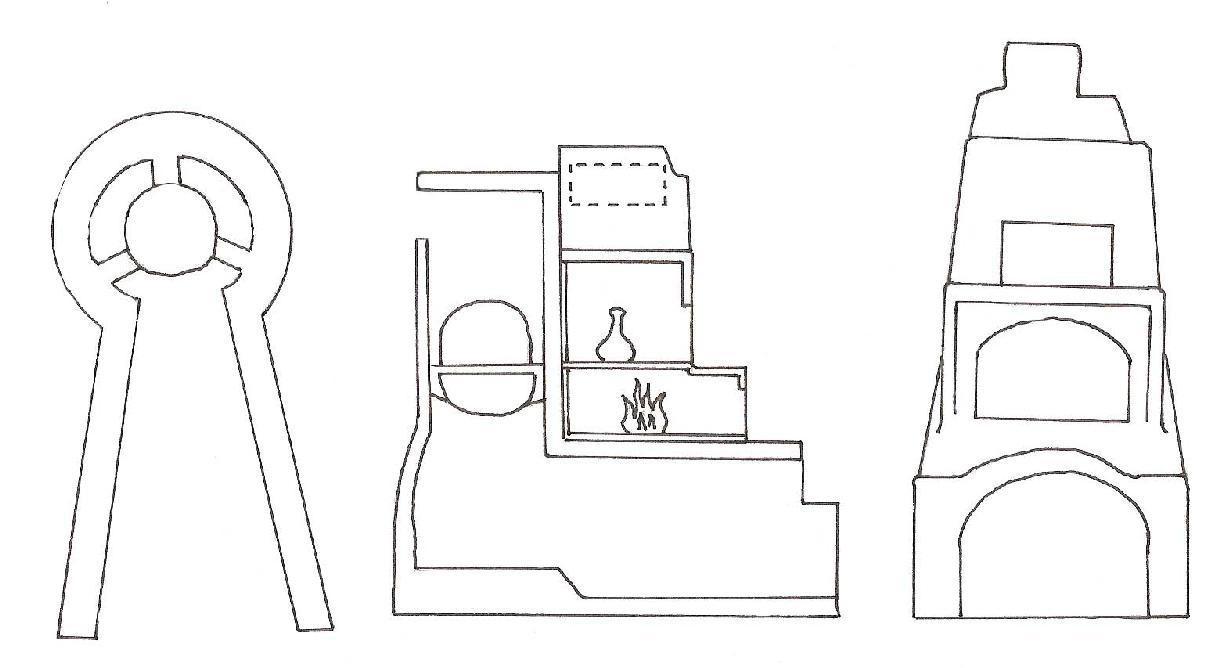 In spring 2009 we decided to demolish the large furnace due to space and because of the large amounts of wood it needed, and to rebuild it. It was now rebuilt along the same lines as the small oven, but now included thicker outer walls for stability, and an integrated cooling oven to relax the glass. In this model the warming cupboard had to be separately heated, so that the beads which might later be produced could relax there (See Figure 9). The new furnace was built on the foundations of the older version, that means again we followed the groundplan of the furnace from Aix-en-Provence (Wedepohl 2003, 62, Fig. 21). The above ground part was modelled on a drawing from an oil lamp from Asseria (Archaeological Museum Split). The furnace was carefully fired after two weeks drying time. It was then operated for two days at Whitsun 2009.