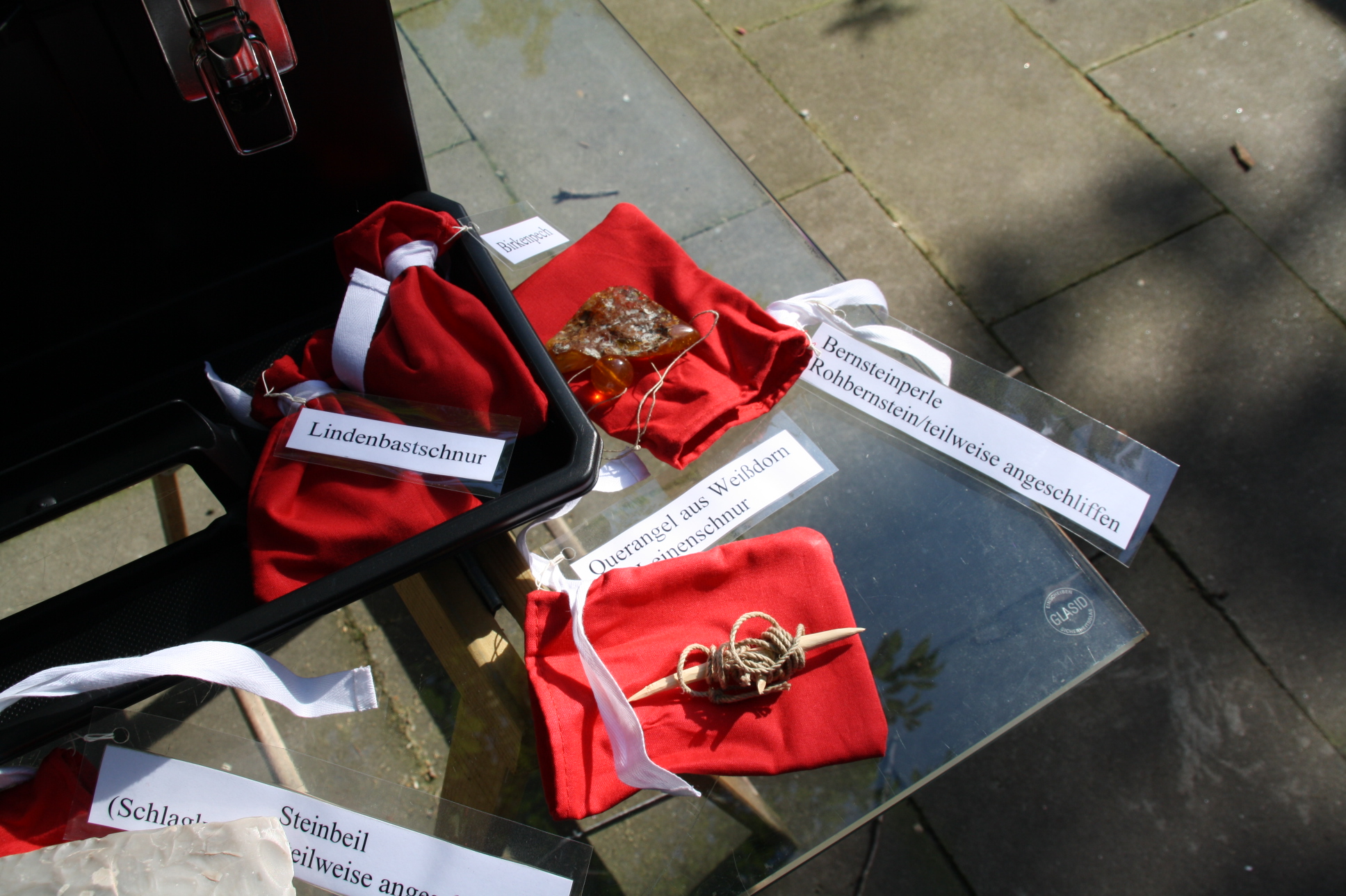 A script is provided to the staff to acquaint them with the contents and the story lines. For each era three modules were drafted: Everyday life, Life style and unknown cults and burial rites. The modules are based on questions regarding historical and material traditions. The texts are drafted based on the following questions: exchange of goods, tools, and jewellery. Included in the texts are the descriptions of the reconstructed objects. The objects should be handed around, touched and viewed.