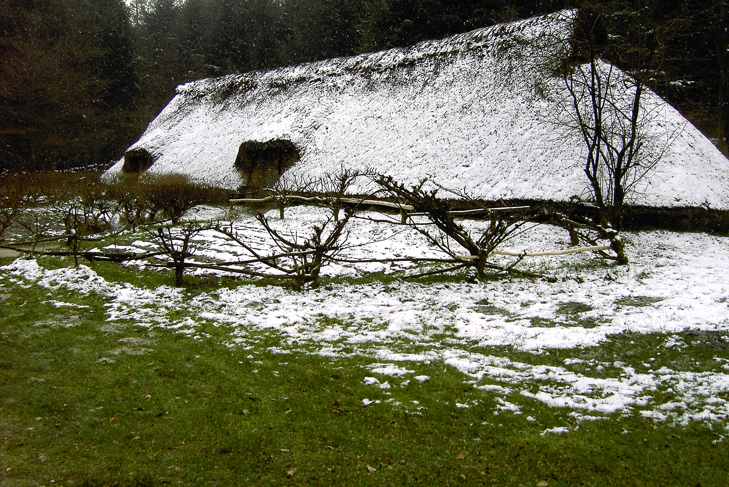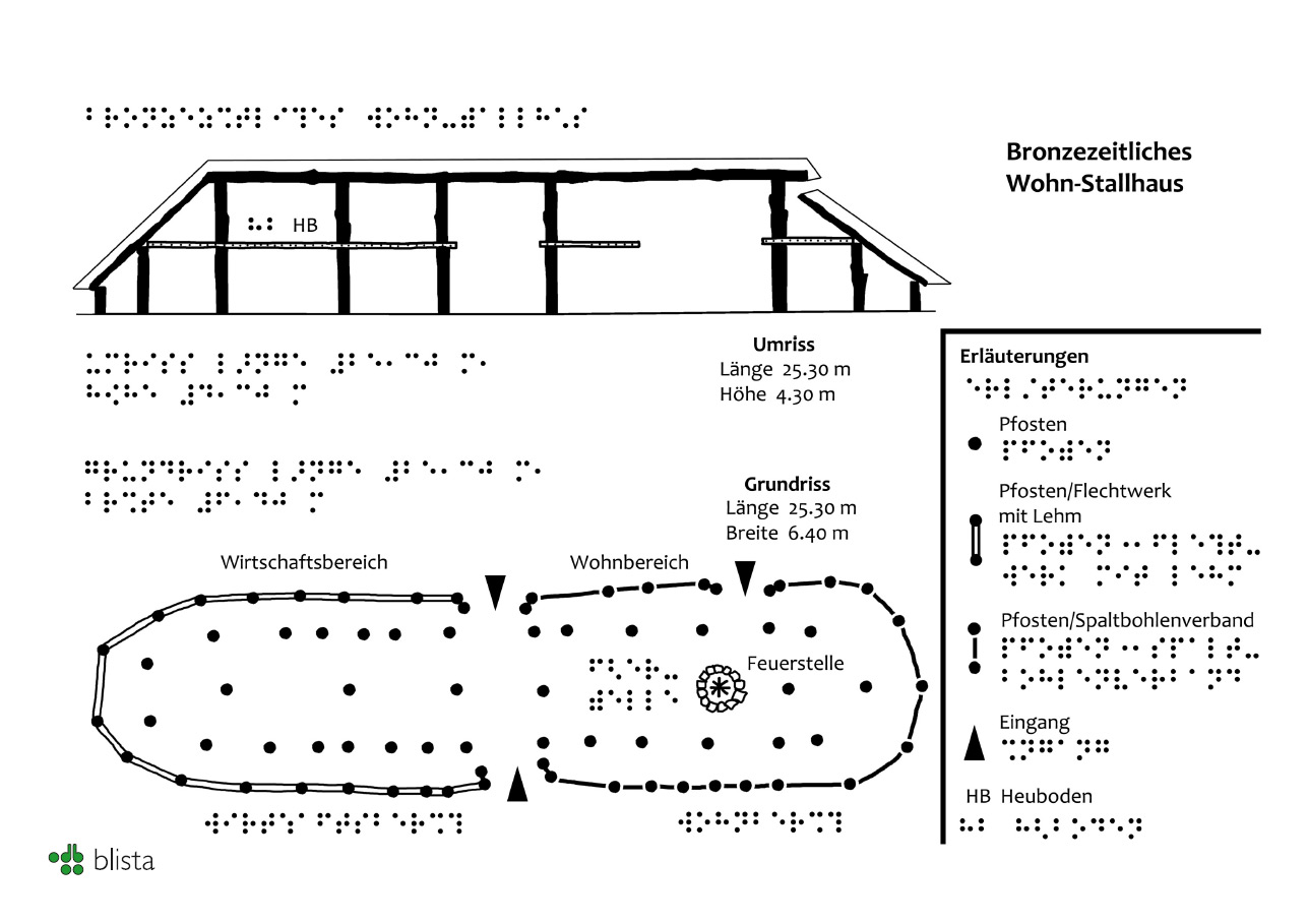 The main focus of the inclusive guided tour will of course be the houses in the museum area. The Stone Age is represented by the 1978/79 assembled building of the Rössener Culture (4500-3900 BC). The Bronze Age is represented by a house built after a pole floor plan from Telgte/Münsterland, and the Early Middle Ages by a house reconstructed in 2006 after findings from Halle/Westfalen. Tactile diagrams of floor plans in Size D in A3 are available for all these houses.