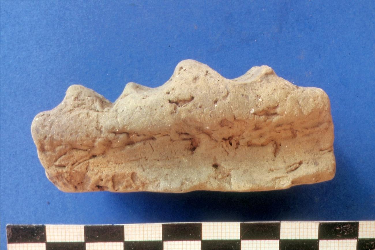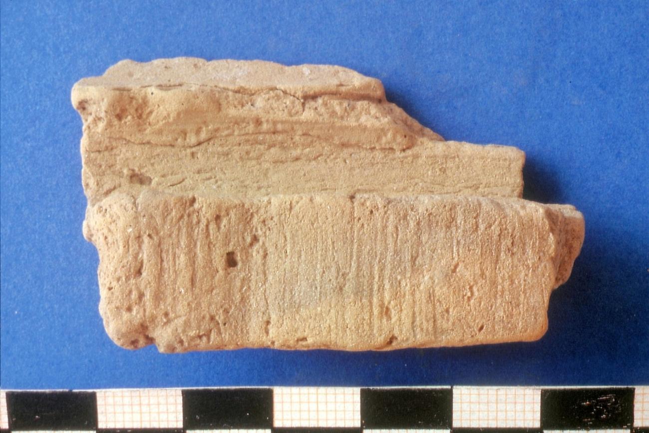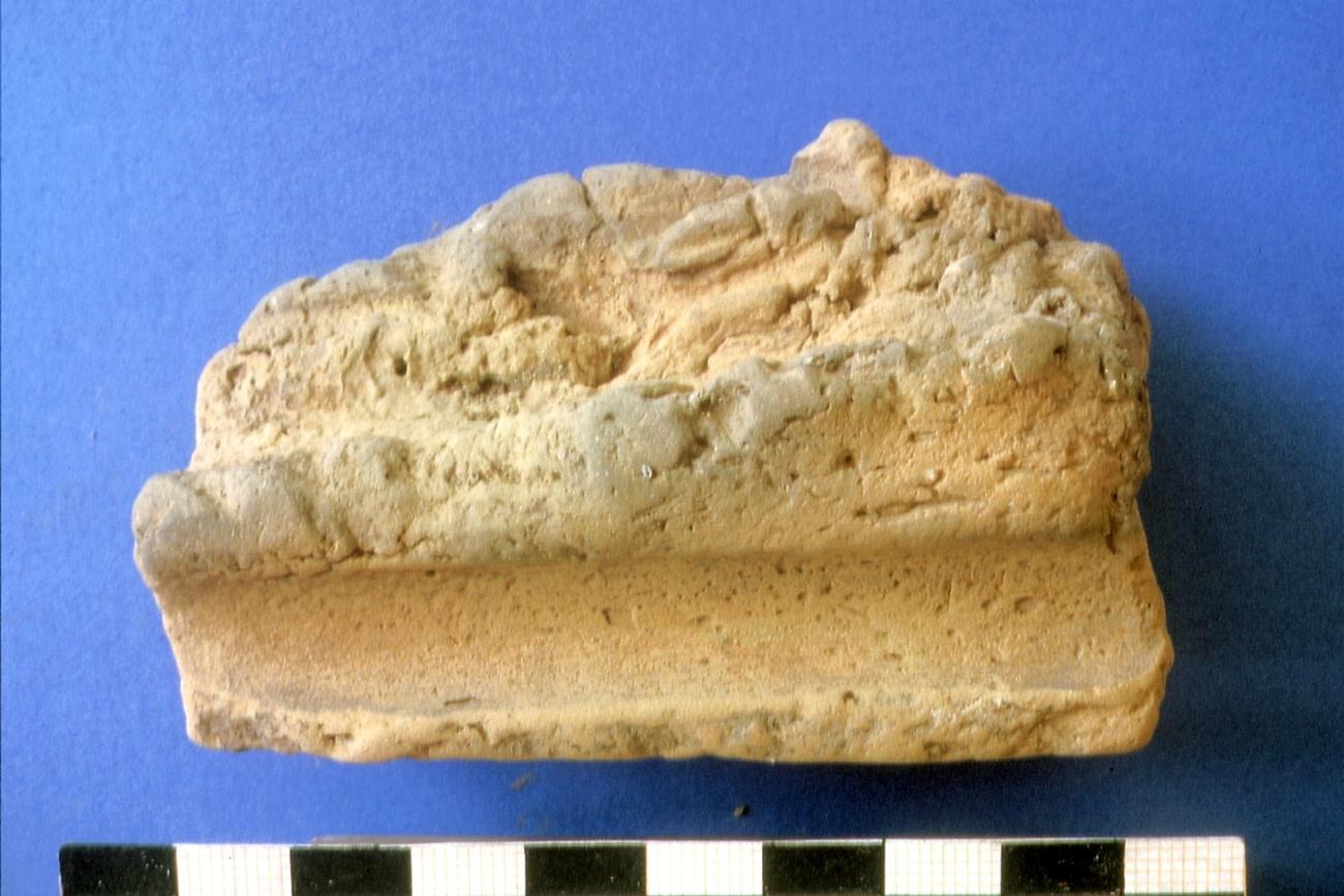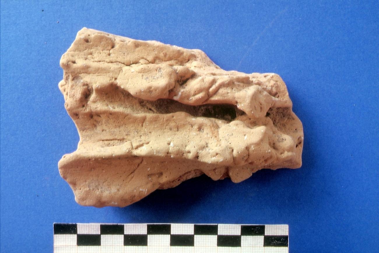 It is probable that the fragments with the narrow imprints of a wooden edge result from the beam construction. These imprints can be seen in places where the covering clay is being thinned out in the form of a hollow profile on a wooden edge. As the clay in these places becomes thinner and thinner, the further width of the wood cannot be recognized.