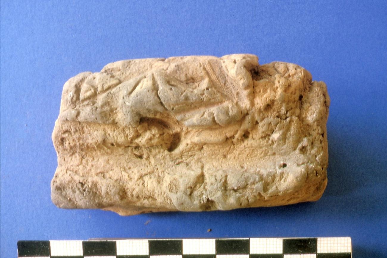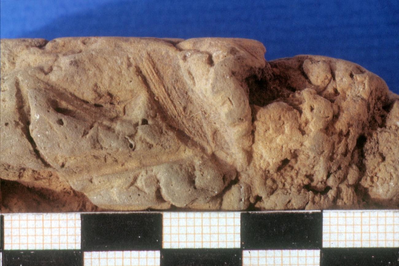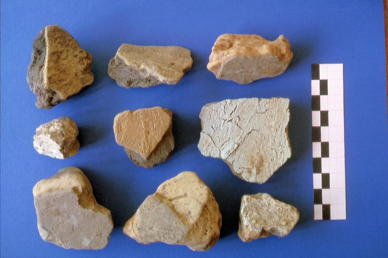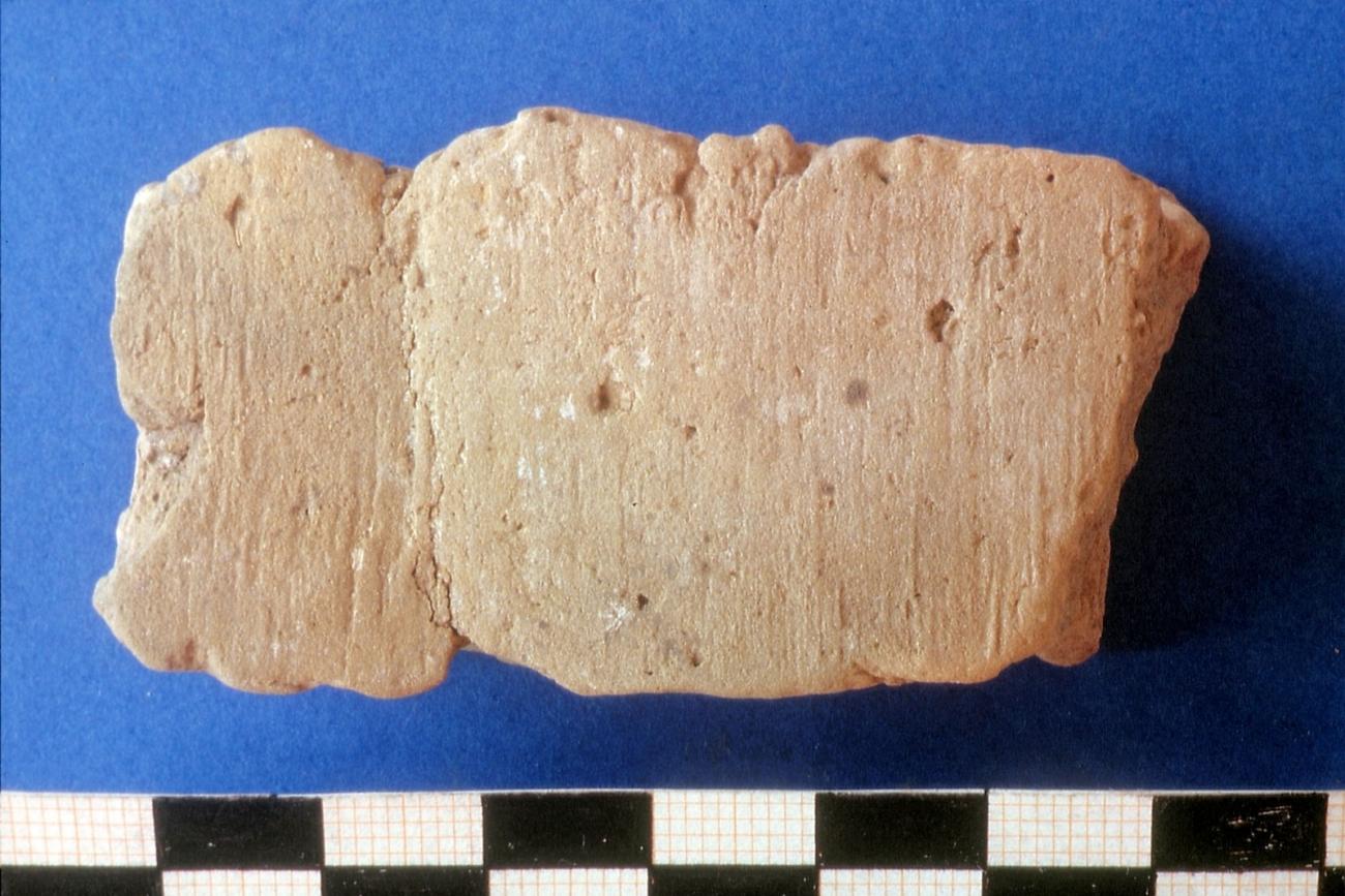 It is probable that the fragments with the narrow imprints of a wooden edge result from the beam construction. These imprints can be seen in places where the covering clay is being thinned out in the form of a hollow profile on a wooden edge. As the clay in these places becomes thinner and thinner, the further width of the wood cannot be recognized.