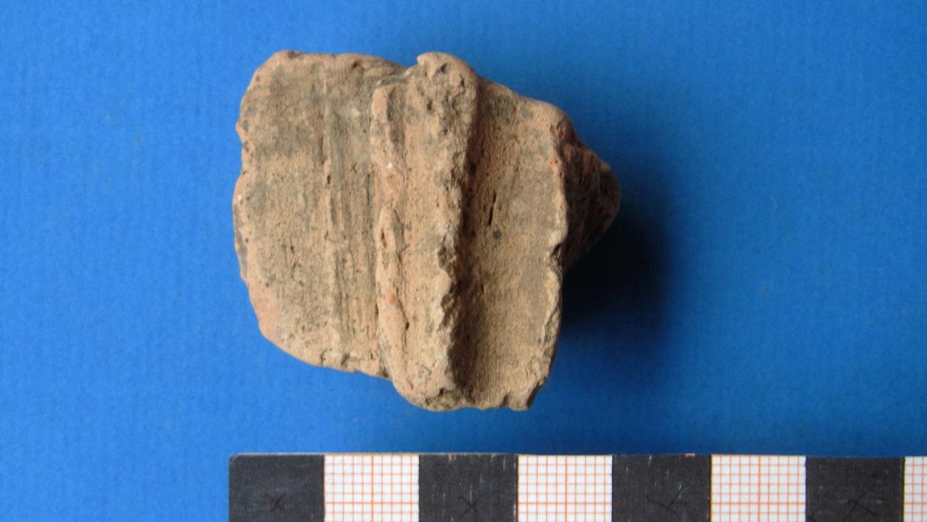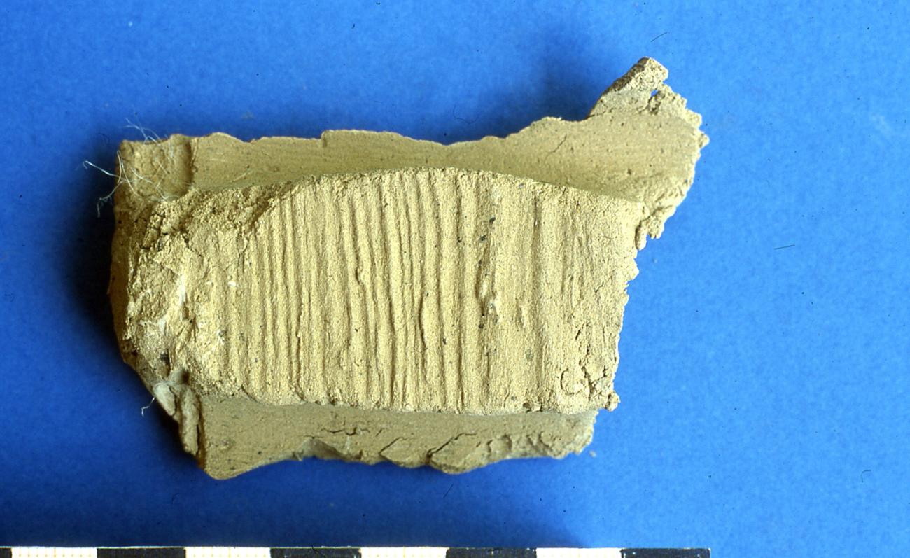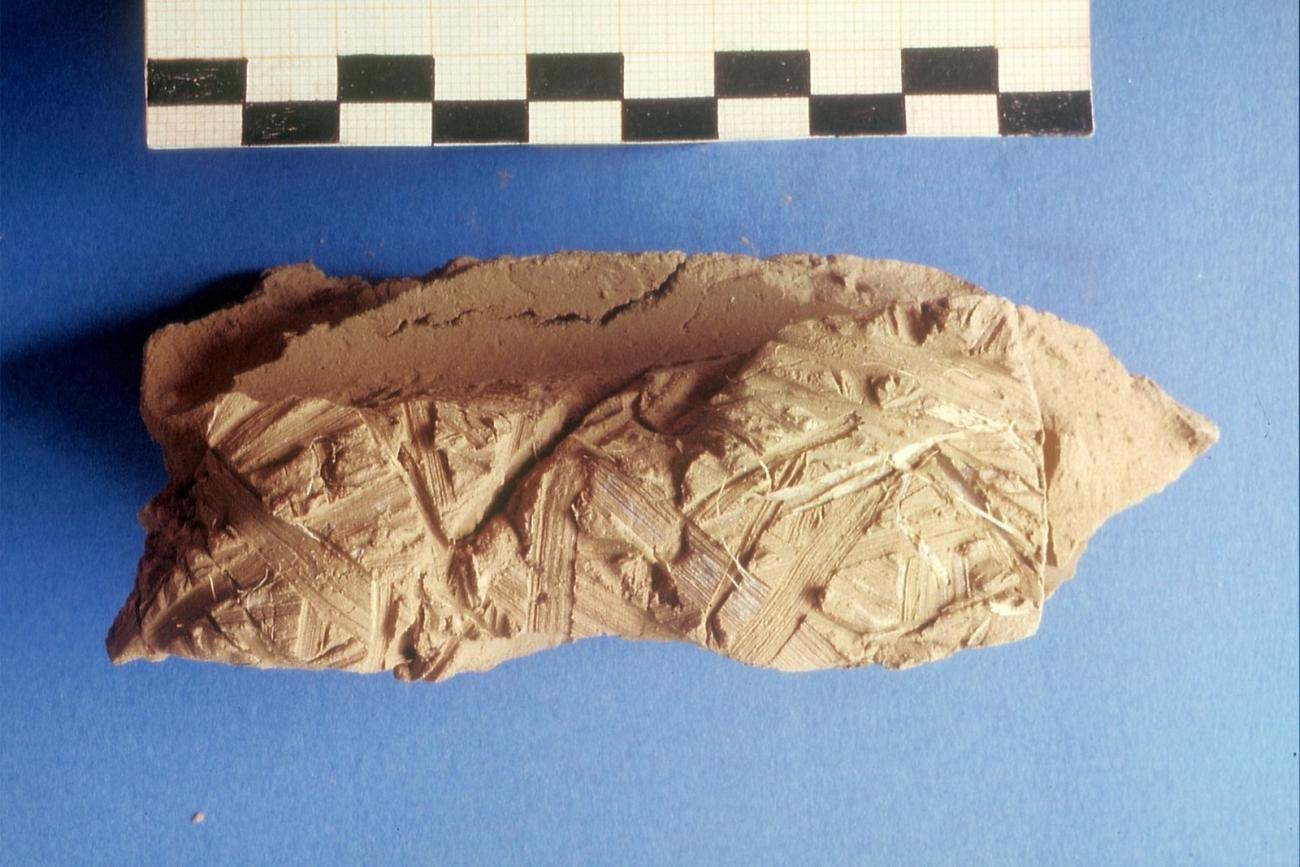 A second indication for two wattle walls beyond the grass imprints are the bulges that were to be found beyond the middle of the woven rods. With a one wattle wall the clay of the opposite side would have met the clay that was first thrown on to the other side.