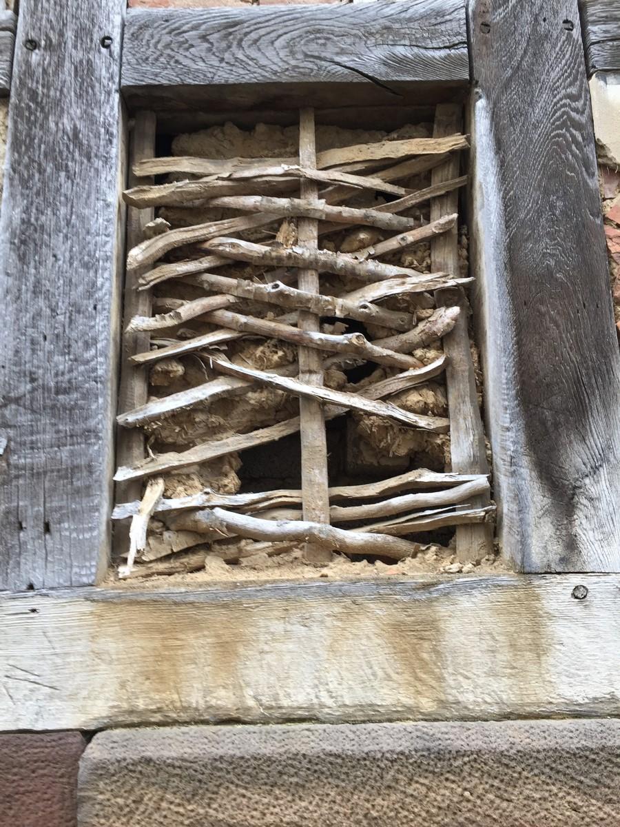 The fragments with smoothed clay on the one side and wood grain on the backside show that the walls as well as the beams were obviously completely covered with clay. The effect is that the building is more fire resistant. This is also why timber framed houses were covered with plaster in former times. Nowadays, the framework of such houses is mostly uncovered. The uncovered beams of such houses often show deep cuts of axe blows. They were used to ensure that the plaster would stay on the wood (See Figure 16). The Bronze Age houses did not need to be worked with an axe as the rods running around the beams in a horizontal direction kept the clay in place.