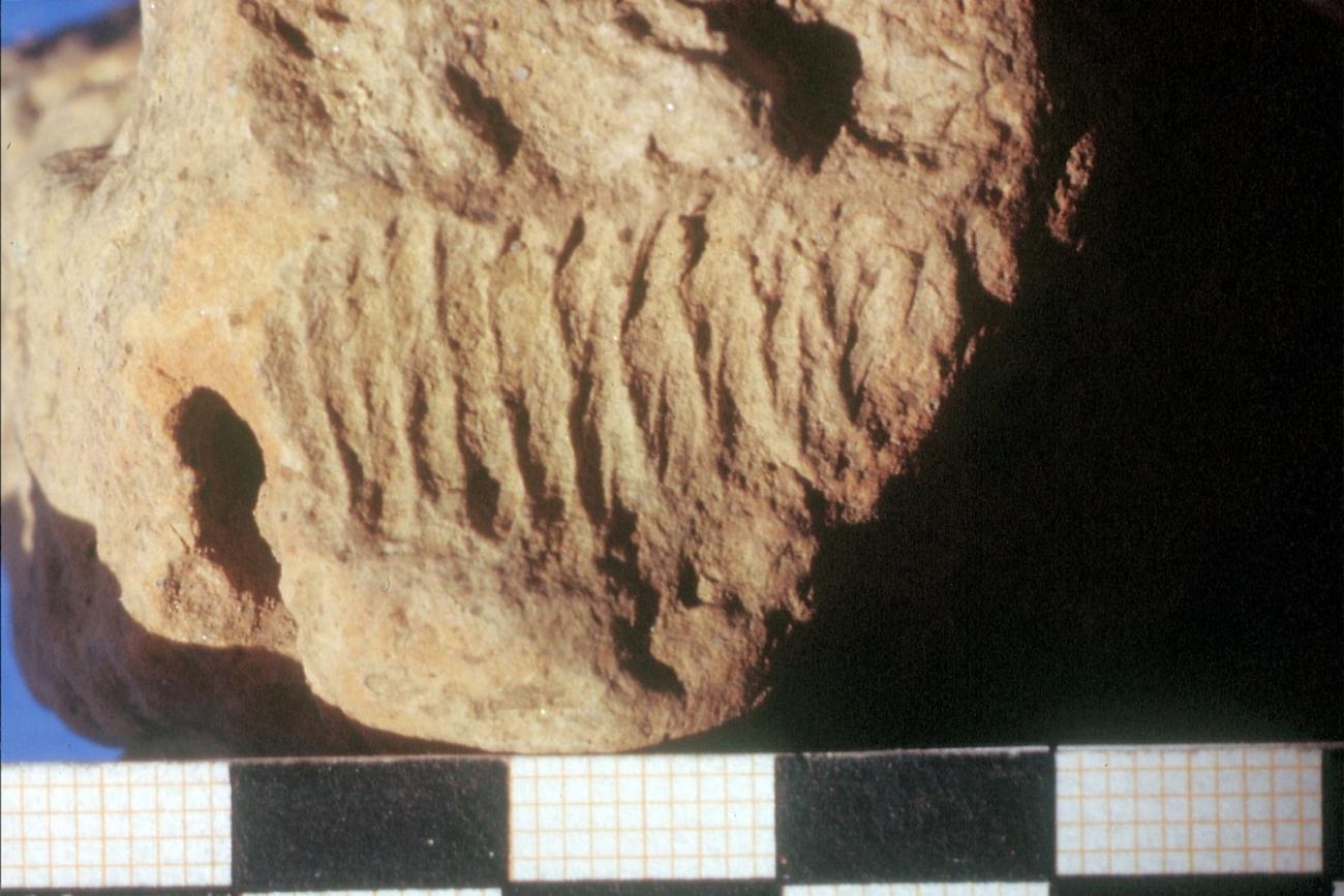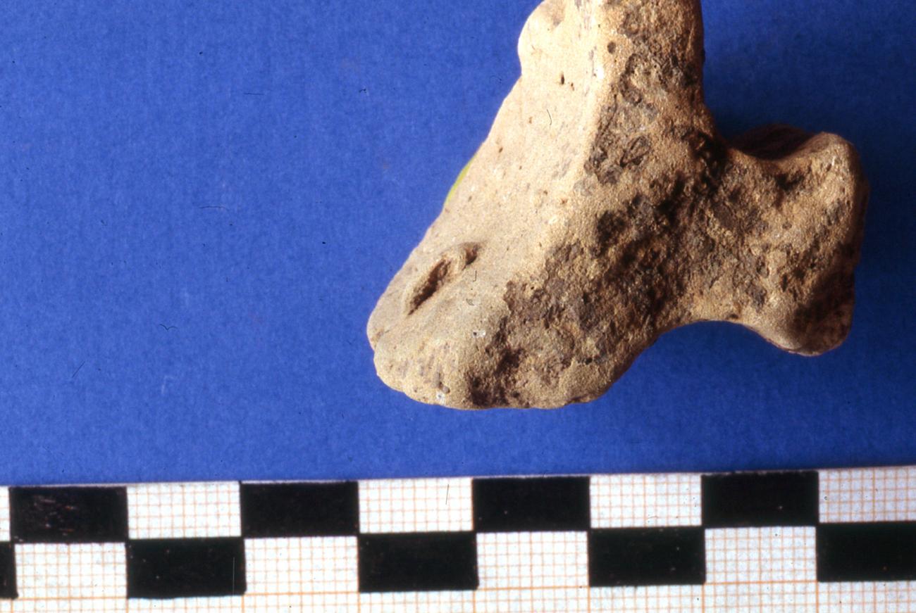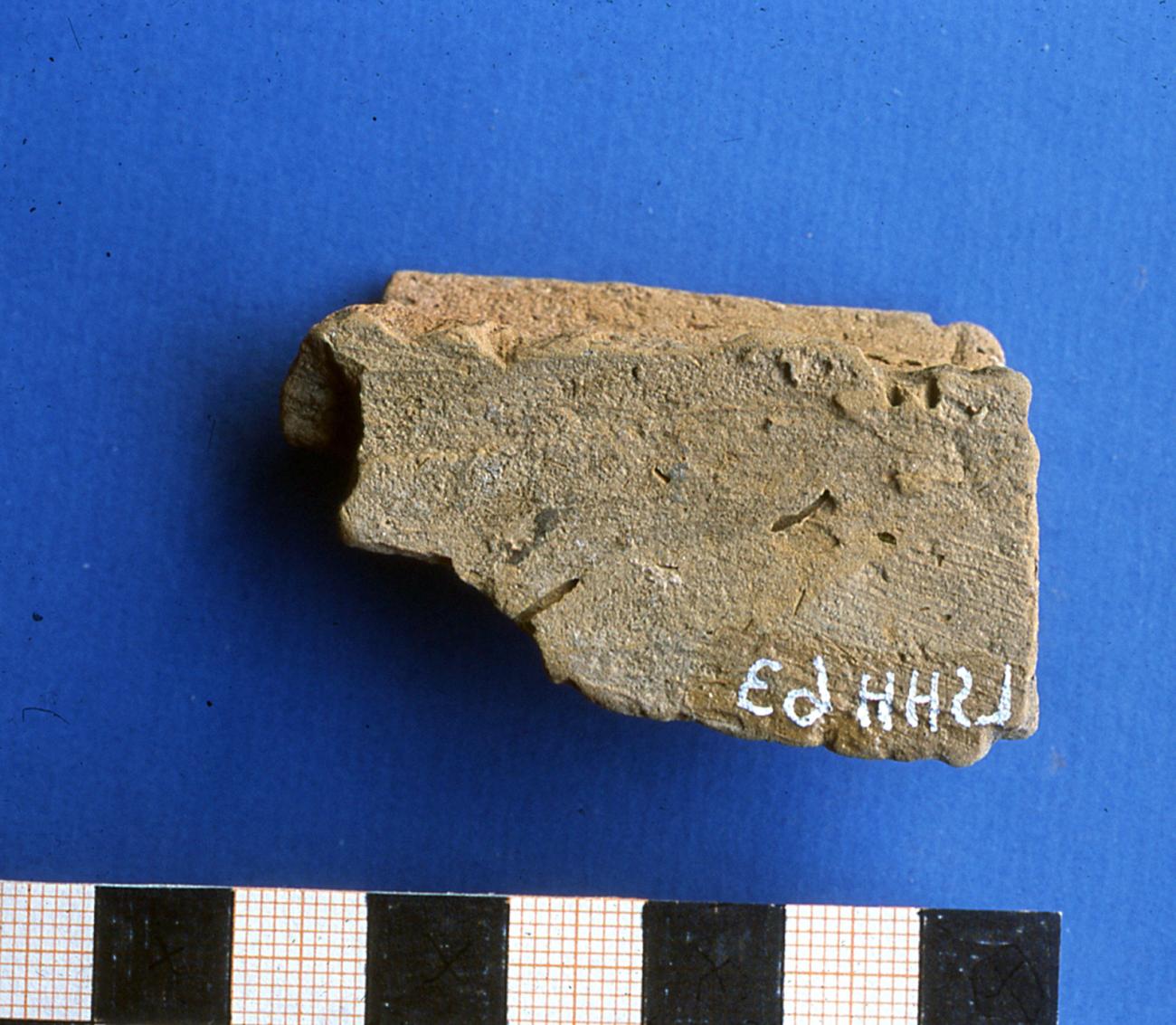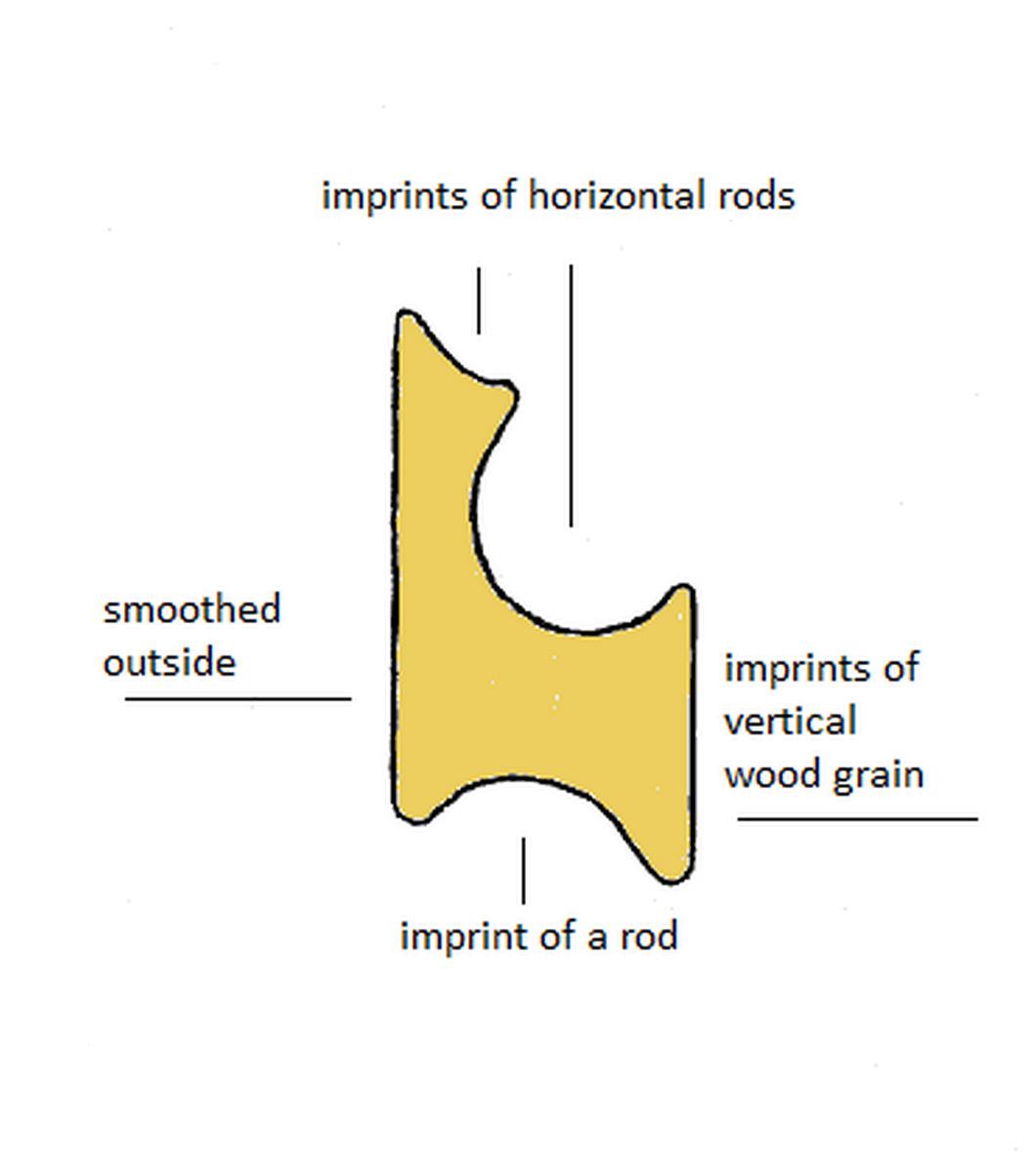 Breakages of the clay near a rod can result from a two wattle construction as well as from a one wattle construction. A clear proof for a construction with one wattle would be a fragment that shows both smoothed outsides with the cavities of the rods in between. (See Figures 25 and 26)