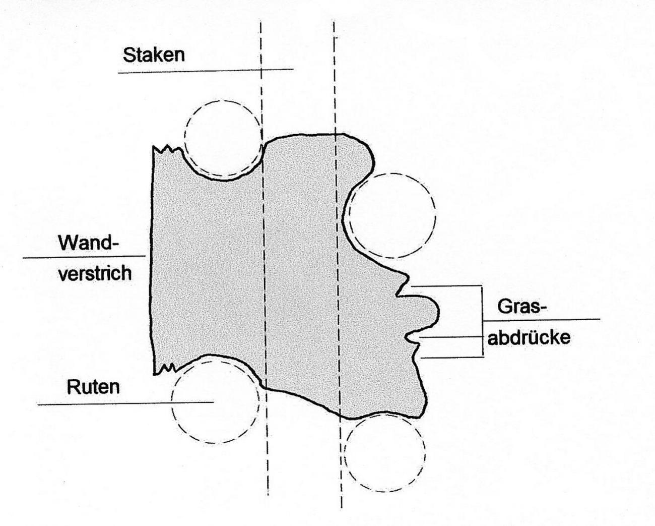 Many heavy clay pieces show these wood weaving imprints on both sides. So it is probable that the outside walls were of two flat wattles standing in close connection, the inside of which was completely filled with clay, a kind of clay that was mixed completely with pieces of straw and husks. Nowadays naturally these can only be recognized after their decay by the remaining pores.