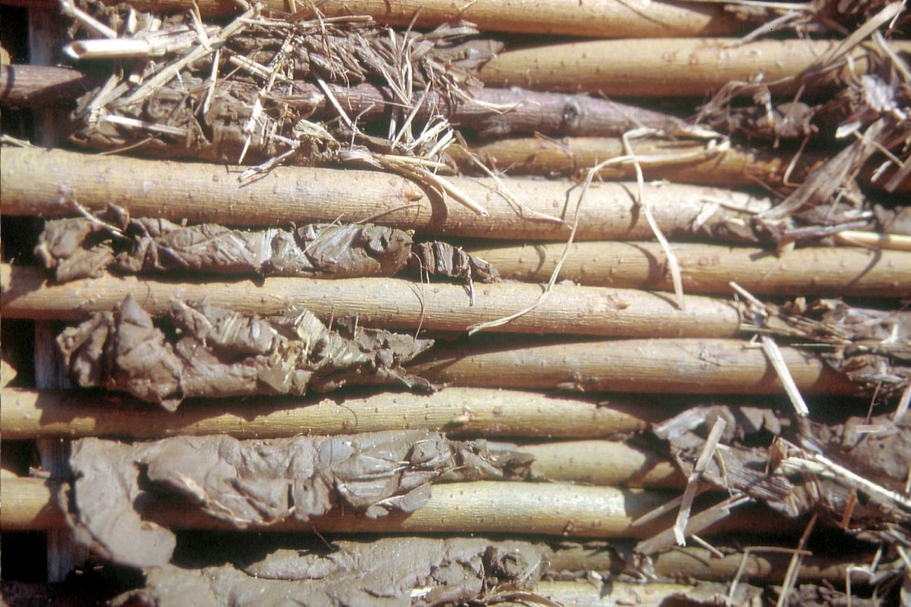 Every second horizontal rod goes around a beam on the outside and clasps it while the alternating one is clamped behind a pole on the inside. Thus the wattles are firmly connected to the supporting construction. Not only are the wattles covered with clay, but also the supporting beams. This would make the walls more fire proof. It appears easier to adapt walls with two wattles to the thickness of the beams because the distance of the wattles can be varied. Such a wall is easier to smooth down and is more stable than a wall with just one woven wattle inside, and also has the advantage of providing greater insulation. In an experiment such a double construction of woodwork was stuffed with dry grass and then covered up with clay. After drying, the clay had the same structures as the Bronze Age clay.