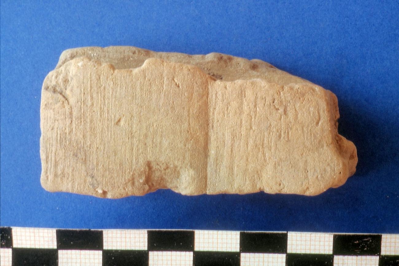 Nevertheless, the imprints show that poles or rods of the wattle were cramped behind a piece of edged wood in a vertical as well as a horizontal direction. It is difficult to decide to which part of the construction this piece of edged wood belonged, perhaps to a door or window. Whether this wooden edge was horizontal or vertical can only be concluded by one fragment: Here a clay drop fell on the hollow profile indicating that this piece of wood had a horizontal position (See Figures 17 and 18).