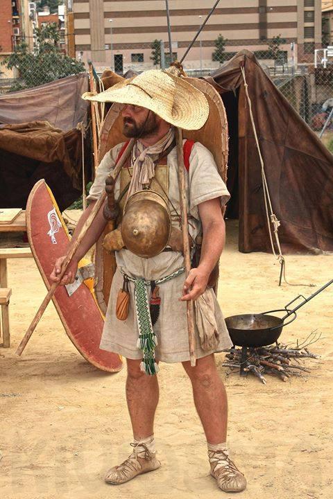 Finally, we also studied the way the soldiers carried their equipment, and how it could be improved to reduce the risk of injuries and pain. For that, seven participants (the eighth one was responsible for logistical tasks) were characterized as consular troopers (velites, hastate, princeps and triarii) and as auxiliary troopers (Iberian- Layetanian or, in other words, Iberians from the current area around Barcelona city). The army on the Roman Republic was defined by age and social status. The youngest members were the velites, the light infantry. Their equipment consisted in throwing javelins, a sword and a small round shield. Hastati and Princeps were the line infantry and their shared many similarities in their equipment. Both used a great shield, the scutum, and a sword, the gladius. Also, they carried two different spears, one light and one heavy, called pilum. They could also carry a corporal protection, but it wasnât cheap and their main protection was the shield, so not many soldiers wore it. Finally, there were the triarii, which were the veterans of the army and the richest soldiers. Their function was to act in desperate situations. They were spear and shield, sword and corporal protection. All this equipment could show several differences in decoration, pictorial motives, etc. reflecting the different precedence of the members of the army (Burns 2003). To reflect this particularity, the triarii in our experiment was dressed as a Samnite, a tribe of central Italy.