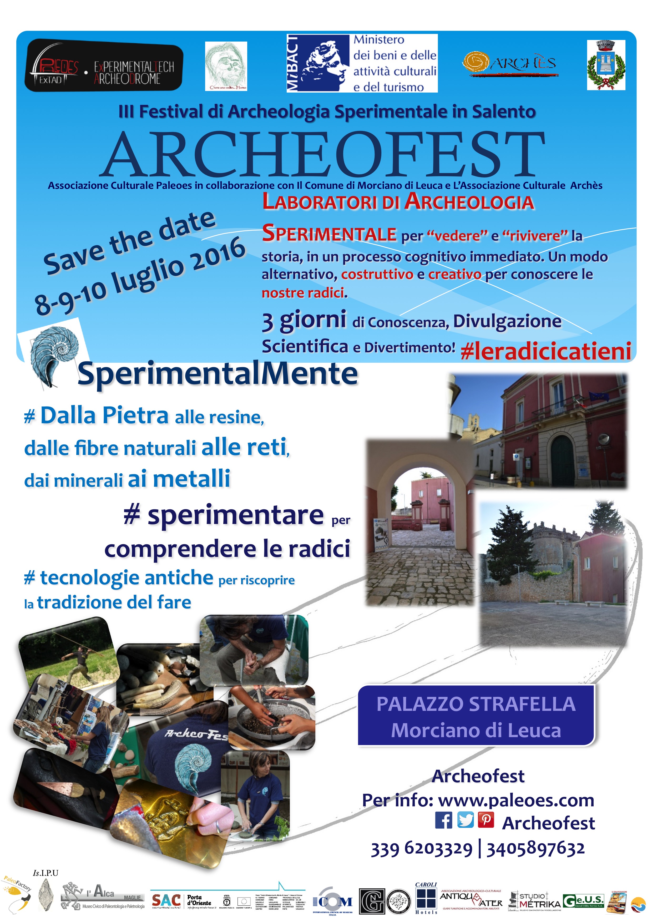 The third salentina edition of Archeofest was held between the 8 - 10th July 2016, and took place in prestigious Strafella palace, Morciano di Leuca, (Salento, Italy). This edition was heldi n collaboration with the town hall of Morciano di Leuca, the Cultural Association Archès and other cultural partners (See Figure 1).