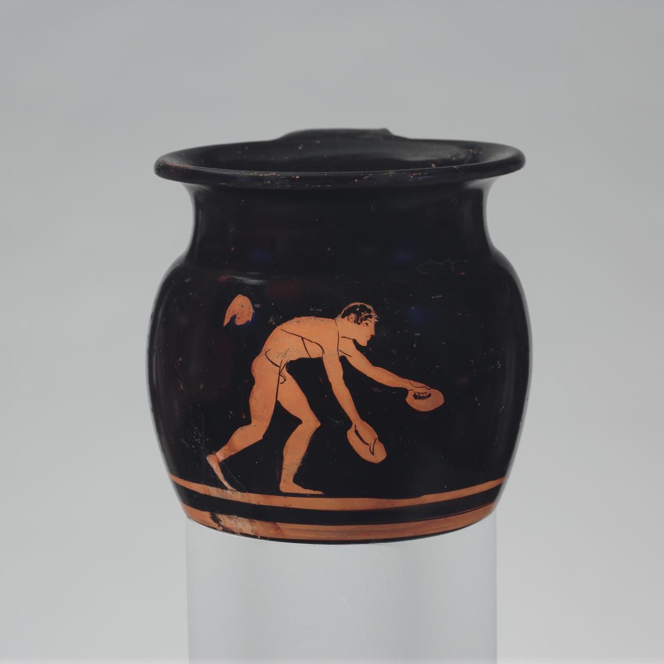 The other source of evidence are ancient Greek vases that depict a variety of athletic motifs and include the haltēres in their depiction of the ancient long jump(The weights are shown either in an athlete’s hand or hanging on walls). The shapes in the vase-paintings reflect the various shapes in the archaeological record. A neck-amphora by the Edinburgh Painter depicts the “phone receiver” type and dates to the beginning of the fifth century BCE (See Fig. 2). Other vases from the fifth century BCE show a shape with a handle integrated into the weight (oenochoe by the Harrow Painter, ca. 490 BCE, See Fig. 3; terracotta mug by the Group of Philadelphia 2272 Painter, ca. 460 BCE, See Fig. 4). No vase to our knowledge depicts the oblong rectangle shape, a type known from the inscribed example found at Eleusis and now in the National Archaeological Museum in Athens.
