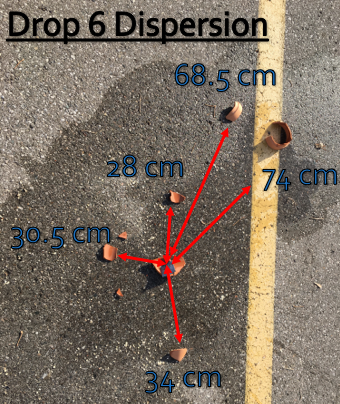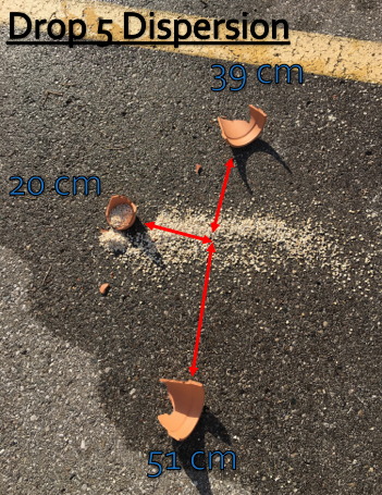 In the future, we recommend that this experiment be repeated recording more data and results by dropping more pots of different sizes, typologies, perhaps by dropping them on different angles and on different surfaces (like a softer earth) with different contents (including empty). A better understanding of how certain factors influence others may be achieved. Instead of using personal subjective observations of how large or small the spread patterns of the scatters were, a statistical method could be utilized to make better use of the recorded measurements. Therefore, enabling a better understanding of how certain factors, such as contents or height, affected the dispersion.
