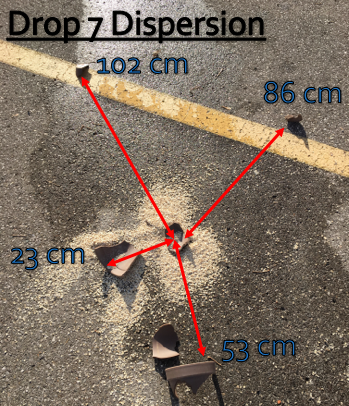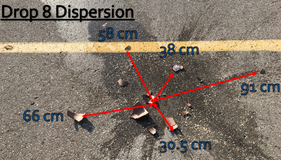 The dispersion measurements of the sherds did appear to be have been affected by the contents of the vessels. When comparing Drops 3 and 4, which were tested with identical height and vessel types but differing contents, Drop 4 had sherds which ended up twice the distance from the point of impact relative to sherds in Drop 3 (See Figures 8 and 9). In this case, the vessel with the higher density water contents dispersed farther from the point of impact. However, when the same trials were repeated at a lower drop height with Drops 7 and 8, these produced almost replicated dispersion results (See Figures 12 and 13). Therefore, the contents would seem to have had some influence on the overall dispersion of sherds; ultimately, the sherds from the vessels holding the higher density liquid dispersed further from their points of impact once dropped and broken. Additional expansive testing is required to determine if the density of the contents of the vessels affects dispersion in specific patterns.