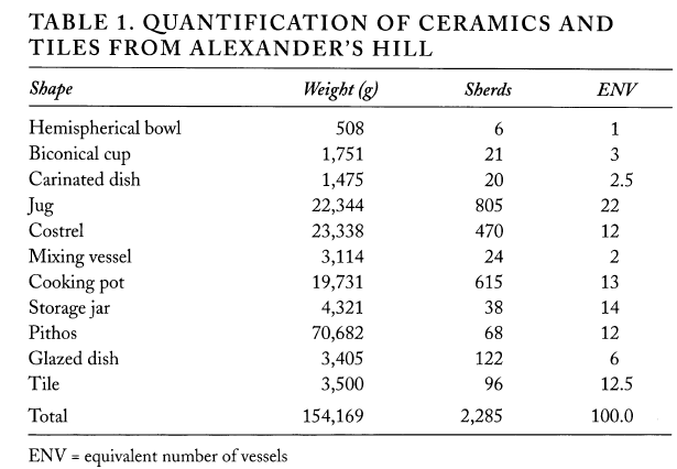 Two sizes of pots were tested in this experiment: a “small” and a “large” size. Alexander’s Hill on the site of Sagalassos in southwestern Turkey, has a Middle-Late Byzantine Period ceramic assemblage. The biconical cup is most similar to the “small” pot type: with an average size of 10 cm x 10 cm (height x width) (Vionis, et al., 2010, pp. 436) (See Fig. 1). The jug is most similar to the “large” pot type: average measurements of 12-17 cm circumference and 19-22 cm height (Vionis, et al., 2010, pp. 437) (See Fig. 2). The “large” pot type was among the most common during the Middle-Late Byzantine Period on this particular site. Figure 3 shows that the most common type and weight of sherd found were of this “large” pot type (Vionis, et al., 2010, pp. 432). The jug vessel type’s similarity in size, desired usage (storage) and frequency (common) to the “large” pots tested made it a perfect experimental comparison of a modern vessel type to an ancient vessel type.