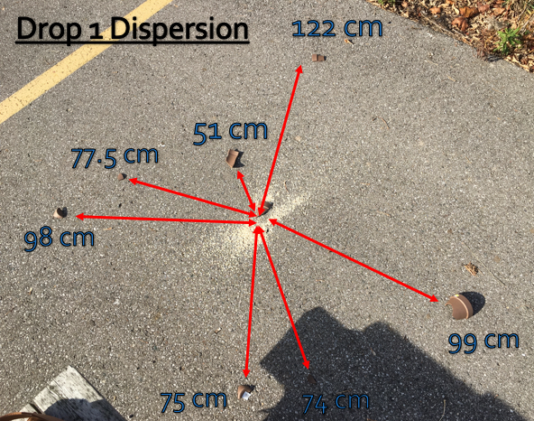 As expected, it was found that as height increased, dispersion of the sherd fragments increased. When the pots were dropped from a height of 180 cm, there was a larger dispersion of sherds compared to the same vessel being dropped from a height of 90 cm with the same contents. This is particularly evident when comparing Drop 1 (small, ½ cup of oats, 180 cm) and Drop 5 (small, ½ cup of oats, 90 cm). Drop 1 dispersed up to three times the distance from the point of impact relative to Drop 5 (See Figures 6 and 10). This is also evident between Drop 4 (large, 3 cups of water, 180 cm) which dispersed almost twice the distance from the point of impact compared to the dispersion of Drop 8 (large, 3 cups of water, 90 cm) (See Figures 9 and 13).