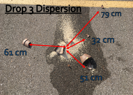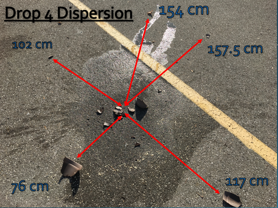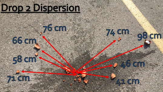 (f) The ‘replica’ pottery vessels used, were gardening pots which had holes in the bases. Since duct tape was used to seal the holes, the bases of the vessels mostly stayed together and were not able to break apart. This variable undoubtedly impacted the results of spread because it was noticed that the bases were shattering. However, the individual broken pieces stayed stuck together due to the duct tape.