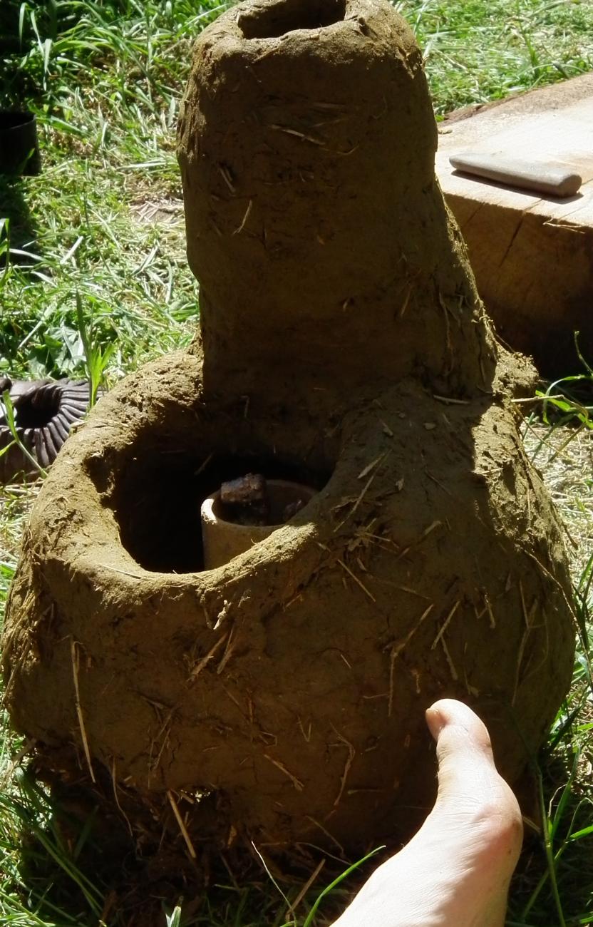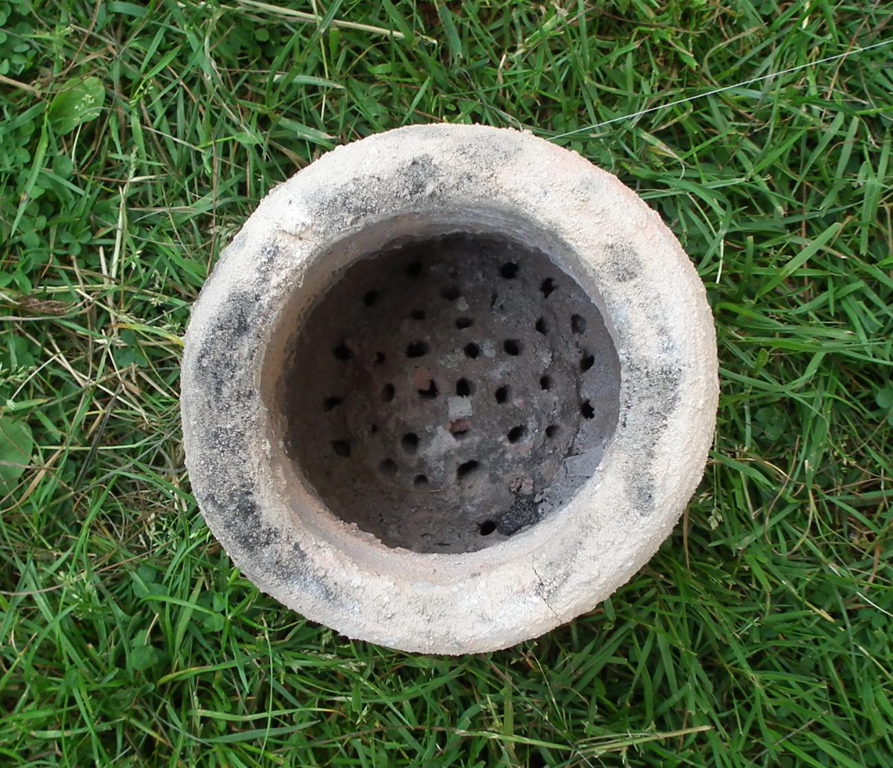 The widest range of experiments was exhibited in the different furnaces that were constructed. Designs ranged from a shallow, stone-lined pit, to a self-draughting furnace based on a work written by Bastian Asmus (Asmus 2009). Other furnaces experimented with air flow, including one with a short chimney. The simplest furnace was constructed by Chris Stein and Kevin Frank who lined a shallow pit with slabs of local sandstone. Giovanna Fregni also constructed a pit furnace, but with two chambers separated by a âteapot standâ, also known as a perforated clay slab. The design of her furnace was the subject of her talk. Thomas Leimbach, whose work focusses on Roman and Medieval metalwork, used a short shaft furnace that also incorporated a perforated clay slab that was built into the structure of the furnace (See Figures 3 and 4). Jeroen van Dordrecht and Jennifer de Jong (preHistorisch Dorp Eindhoven) used an Early Bronze Age horseshoe-shaped furnace that was heated from the side. This was later converted to a circular furnace. Mark Vyvyan-Penneycontinued to experiment with a modified shaft furnace with a chimney similar to one he had previously built (See Figure 5). The most remarkable was Martijn van Es' self-draughting furnace, which did not require bellows, yet produced more than sufficient heat to melt crucibles full of bronze. Although there were some problems with Mark Vyvyan-Penney's furnace chimney, all the furnaces performed admirably, and some exceeded expectations. Thomas Leimbach' furnace reached temperatures high enough that one of his crucibles melted, and Martijn van Es' furnace quickly reached temperatures exceeding 1150°C degrees using only firewood.