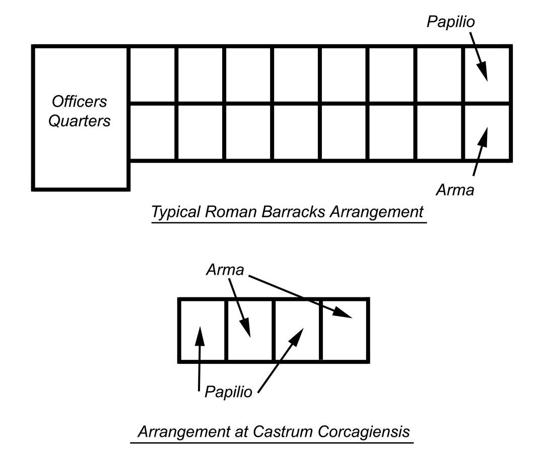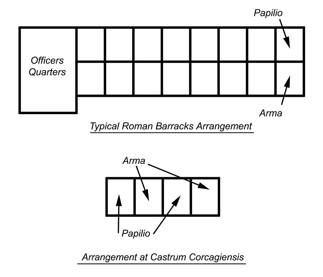 Barrack blocks were a central feature in any Roman fort and functioned as the living spaces for a Century and its officers. While Roman forts varied in size from just over an acre for a simple ‘numerius’ fort, to over 55 acers for some large ‘legionary’ forts such as Deva (Chester), the layout of a barrack block was the same.