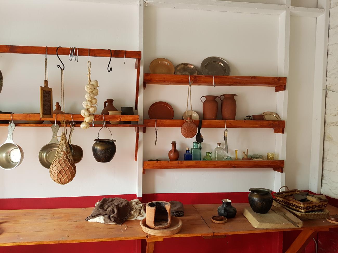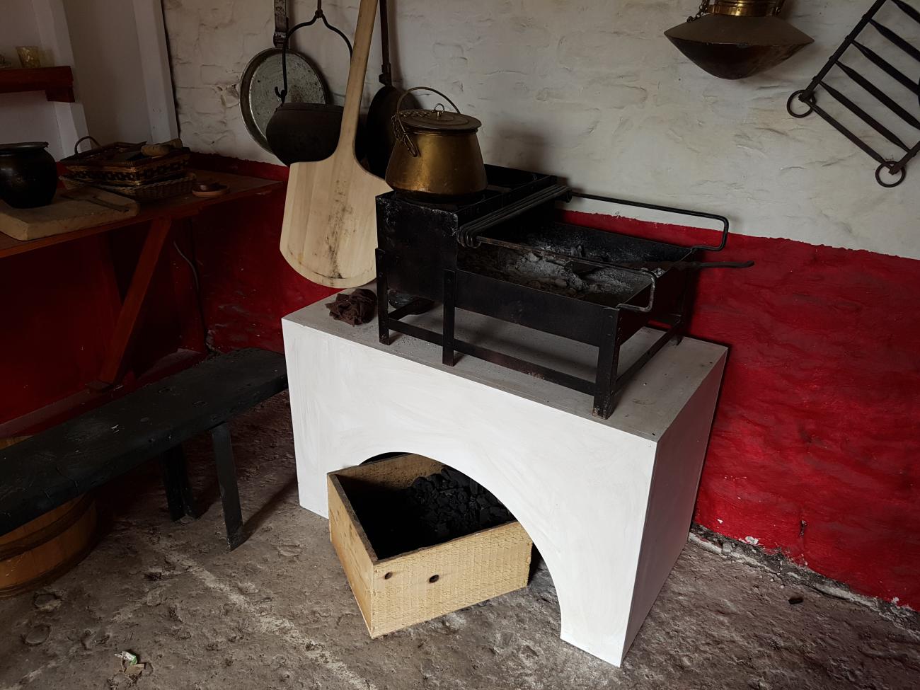 In the end we came up with a room plan with a long worktop along one wall, shelving above it and a simple charcoal-burning Craticula for cooking. A Craticula is a simple charcoal burning open stove on which frying pans and cooking pots can be placed and heated by a layer of burning charcoal in a frame underneath. We decided to use a Craticula because charcoal gives off little smoke when burning, unlike a wood burning stove which gives off much smoke. We didn’t have a hearth or chimney in the room, thus using charcoal and a Craticula meant we could cook without filling the room in smoke. Over the years we had collected replications of Roman cookware and earthenware which we could now put to use (See Figures 5, 6 and 7).
