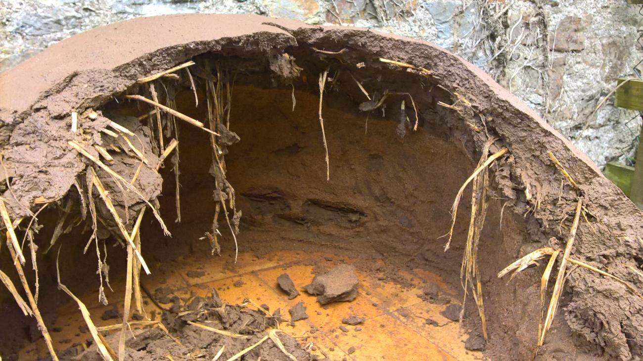 All Roman forts had communal bread ovens. These were probably constructed from stone, but in another compromise, we decided to build a simple wood-fired clay oven. With minimal research and little knowledge we set about constructing our oven, and as expected, the result was a spectacular failure. We did not make the walls thick enough and removed the sand core too early. As a result, the whole thing collapsed into a sorry mess (See Figure 8).