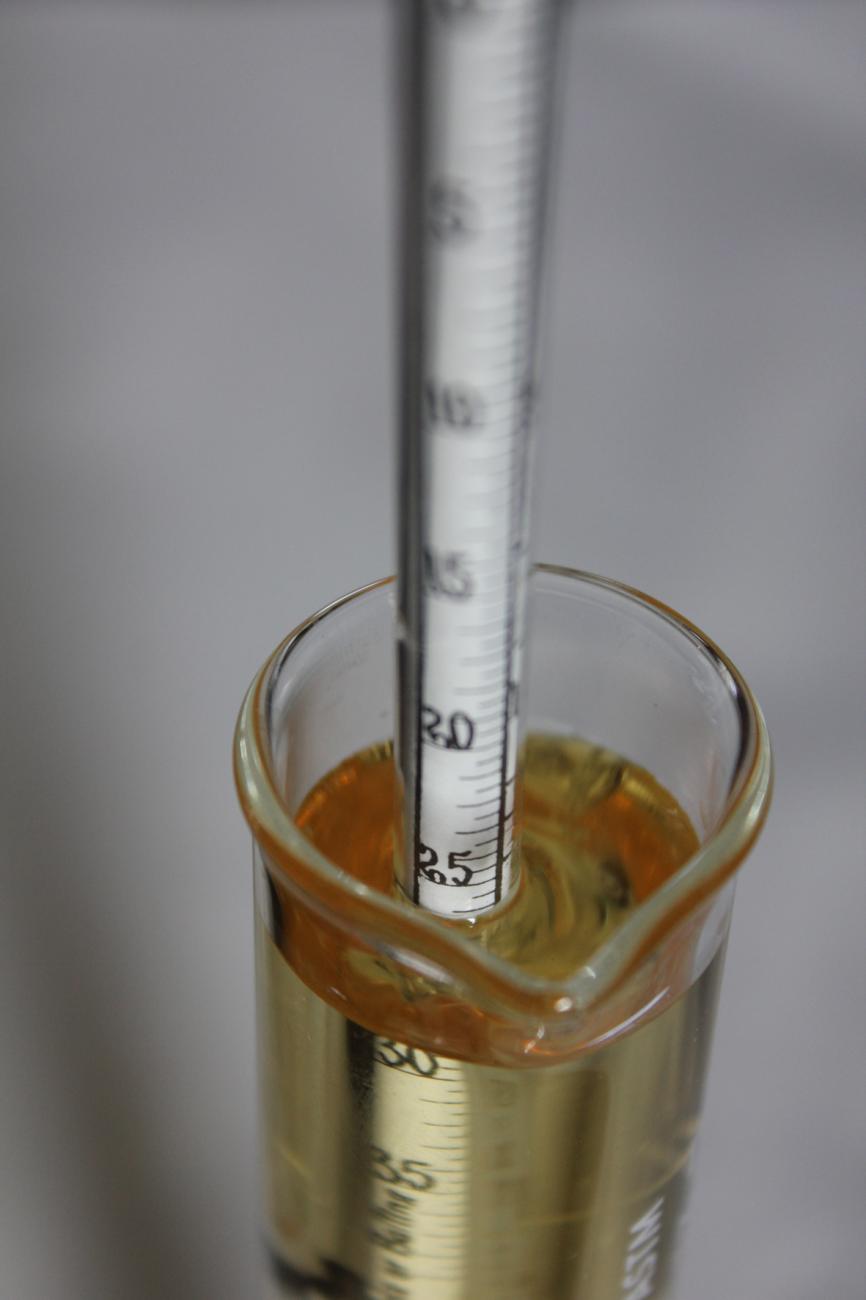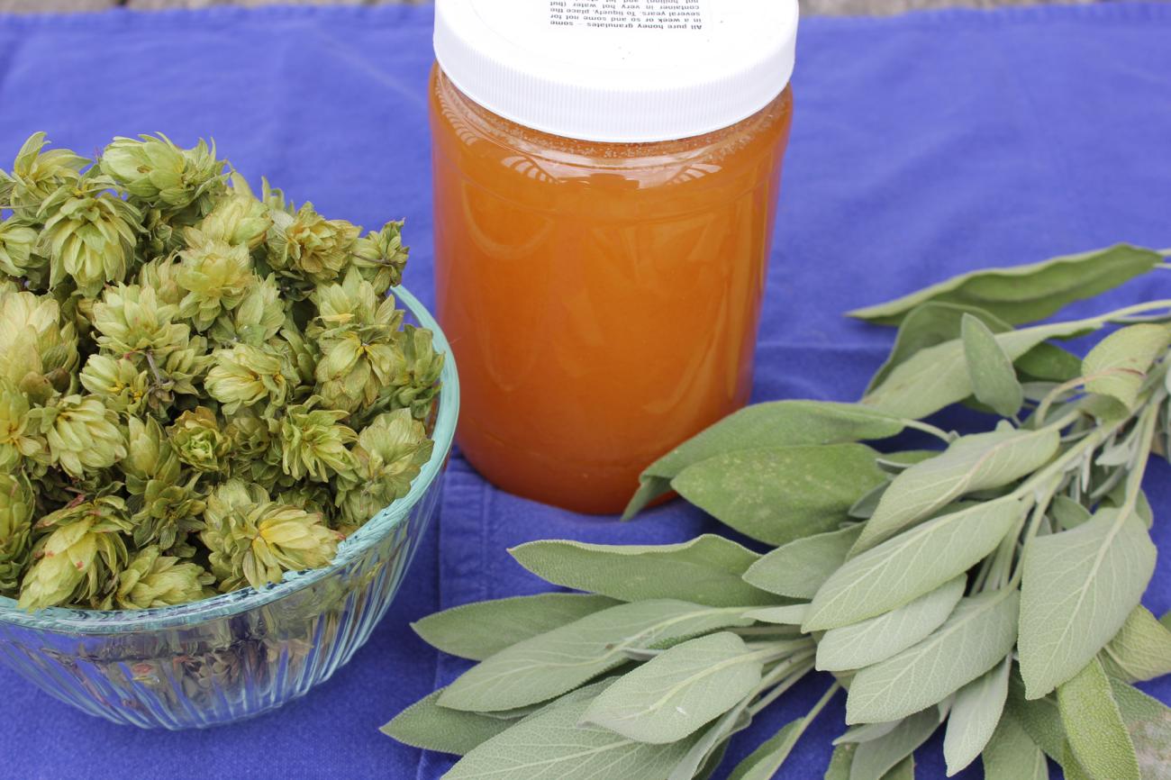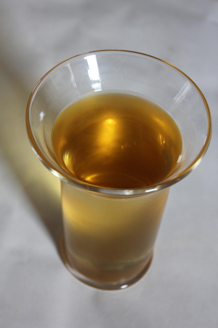 The ingredients for this recipe are honey, sage, and hops (See Figure 8). This replication used the honey-water mixture washed from a beekeeper’s combs after the bulk of the honey was extracted, which turned out to be the same percentage of sugar as prior experiments mixing six pounds of honey with a gallon of water. The hops variety was Tettnanger, one of the Noble German hops, one of the varieties which may date back to the medieval period. The sage was standard garden sage, Salvia officinalis, which is the type which was available in medieval Germany. The mixture (wort) was heated to boiling, skimmed, (See Figure 9) then the hops and sage were added and boiled again (See Figure 10). When cooled, the wort was divided into two batches and fermented in glass jugs. Different yeast was used in each batch: a mead yeast (White Labs WLP 720) and an ale yeast (White Labs WLP 099). A hydrometer reading was taken prior to fermentation, with the sugar content at about 33%. The recipe calls for the mead to be consumed after six to eight weeks; at that time, the alcohol content was about 5-5.5% and the residual sugar was 23.5-27% in each batch (See Figure 11). Longer fermentation did not significantly change that alcohol content with these yeasts; wine and champagne yeasts, used in earlier experiments, have yielded higher-alcohol meads following the same process. The final product was quite sweet, but the addition of the hops and sage balanced the flavor in the same manner as in beer production. The mead was quite clear after eight weeks as a result of the initial step of boiling to remove the proteins and sufficient time to allow the yeast to settle (See Figure 12).