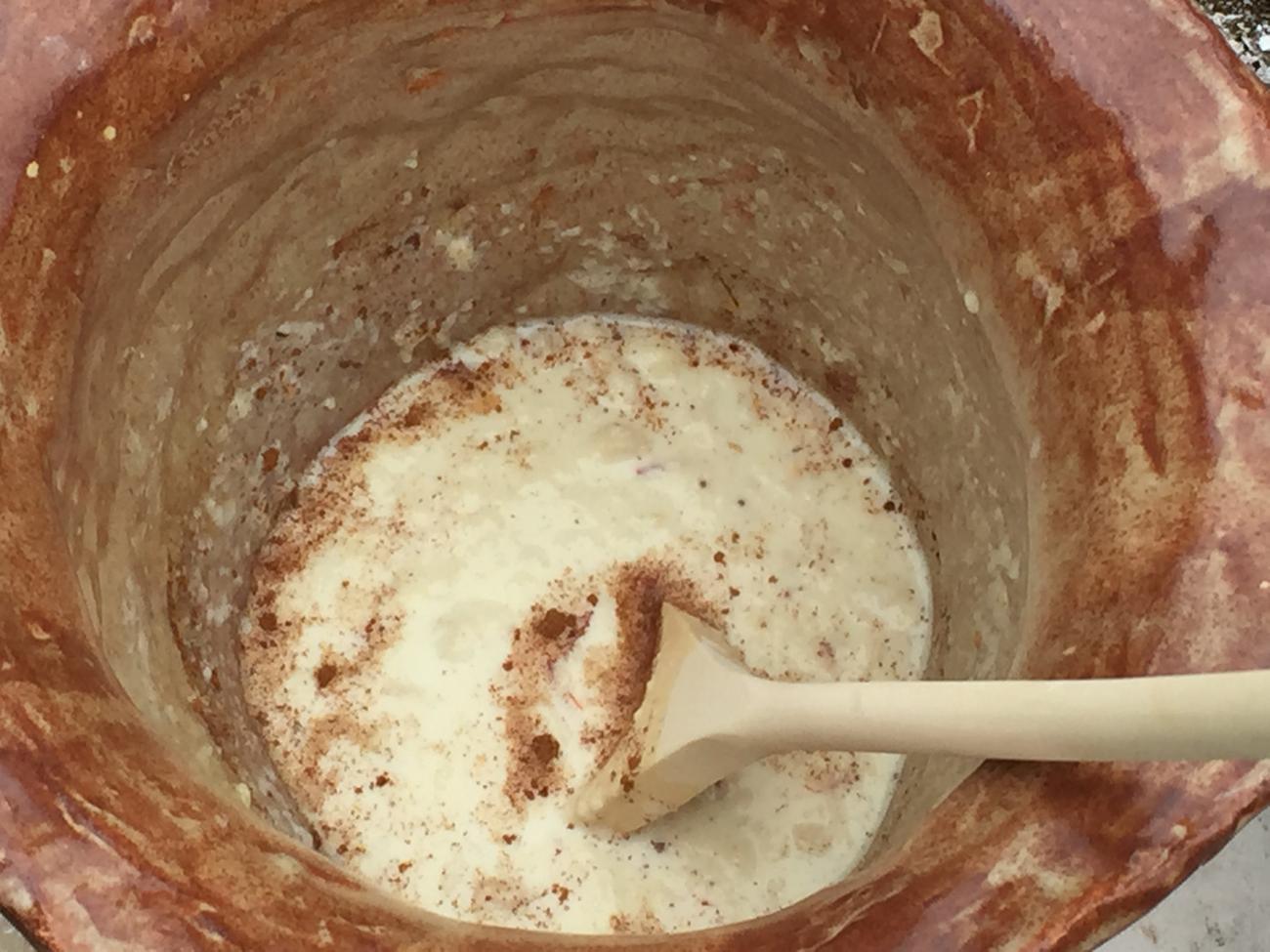 One vessel was used for this dish, heating the milk, adding the bread, saffron, honey, and spices (See Figure 6). This was called Golden Bread Pudding by the participants.