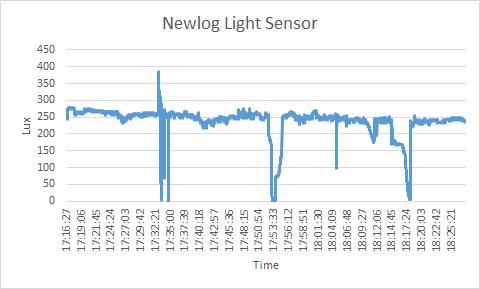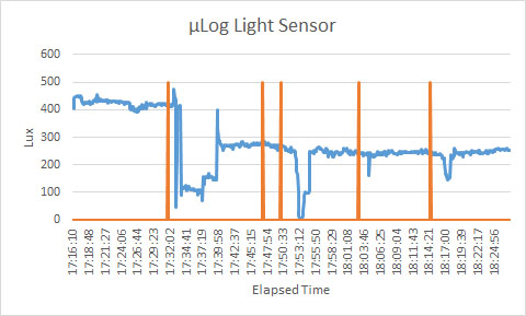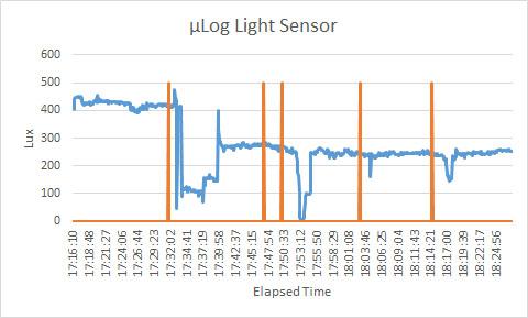 Both sensors record drops in levels at 17:53, 18:04, and 18:17 which match the removal of ceramic plates 1, 2, and 5 implying that as the plates were removed the sensors were momentarily blocked. The Neulog also recorded the removal of plate 4 at 18:11 although that did not impact the μLog. Neither sensor recorded a change when plate 3 was removed leaving an open question of what was different between the movement of plate 3 and the other ceramic plates. Had there been a video record or additional staff, it is possible that an explanation might have been recorded.