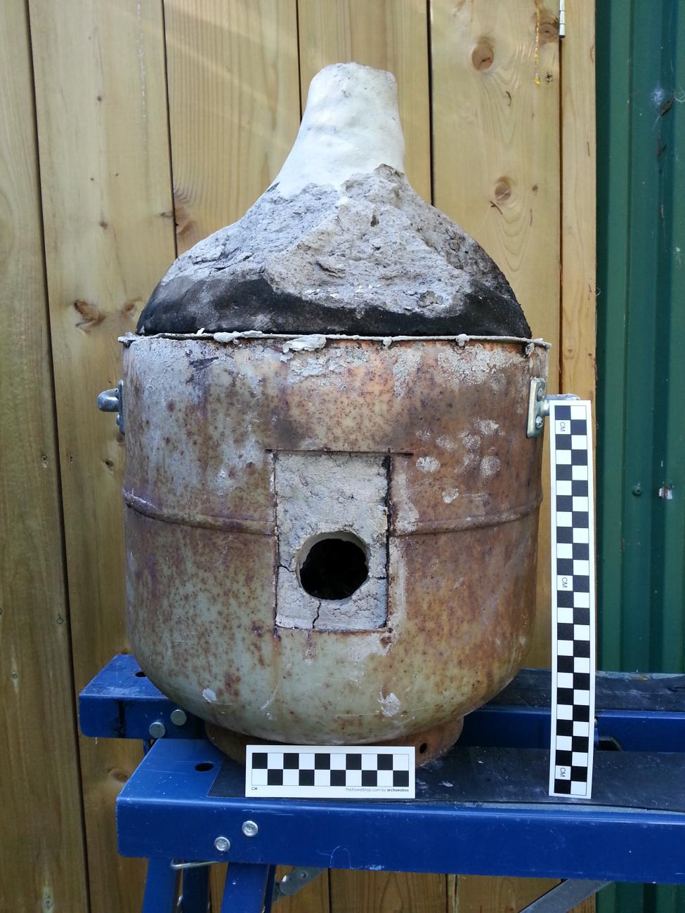 The body and top were allowed to air harden before being fired to a ceramic. Firing the cob is required, otherwise the majority of the heat generated would go to driving water out of the cob rather than generating the required heat levels to melt the glass. This heating and the related sintering of the cob into ceramic must be carried out slowly allowing the water within the matrix to evaporate a little at a time, rather than explosively converting to steam causing cracking. To encourage this process, the bottom of the furnace was fired first without a top in place, which worked very well. The tops are a different matter as they concentrate the heat as it is produced. This means the fire must be balanced between going out due to too little fuel, or cracking and breaking the top when too much fuel was added. In this sequence using a pre-fired body made the problem worse. Two tops broke during the firing process and had to be replaced. The third top worked sintering6 without cracking or breaking. It should be noted that due to the thickness of the cob structure the furnace is never fully sintered. It grades from a completely fired interior to a completely dry mud. This will have a clear impact on the taphonomic process as the outer surface will be easily weathered away, while the interior might be expected to survive, but will be thin enough to suffer significant breakage in the freeze/thaw cycle.