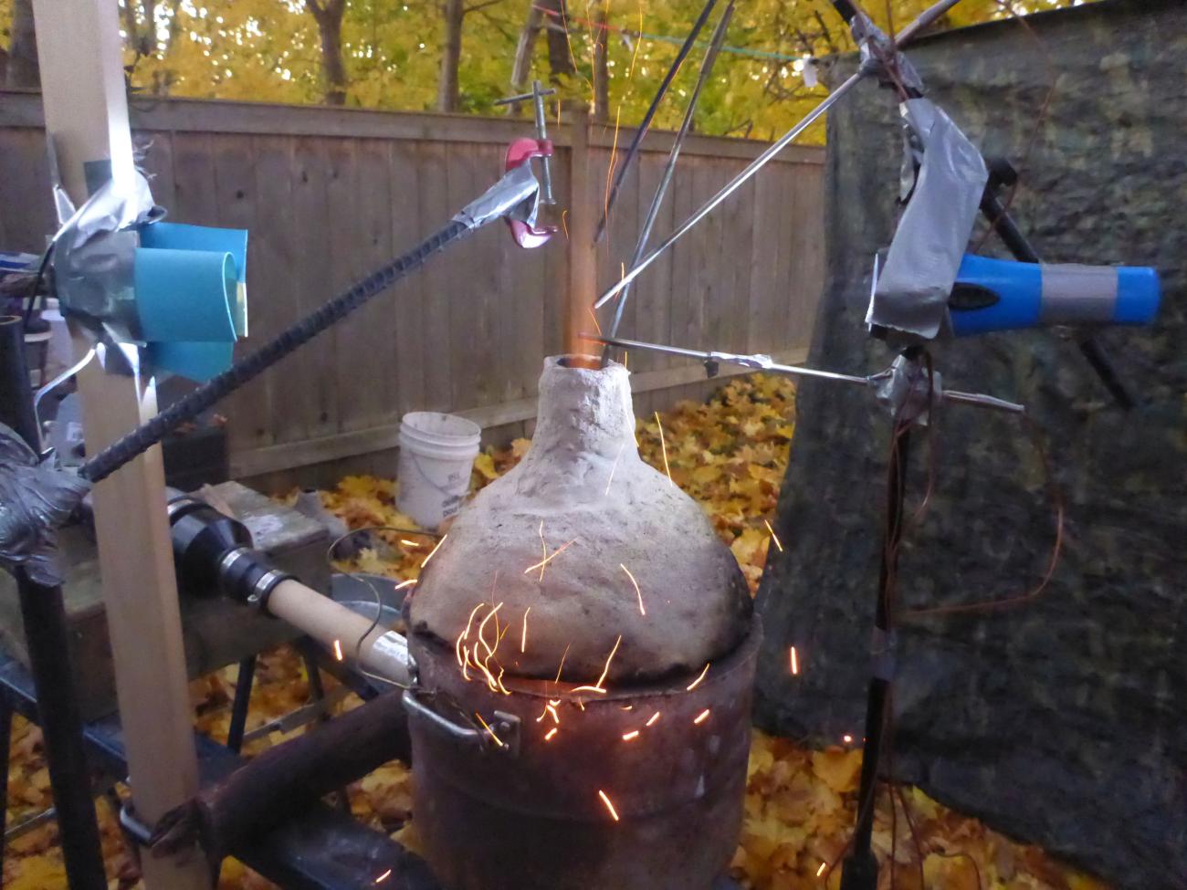 Humidity enters the experiment chain both through the humidity level of the charcoal and in the air being forced into the furnace. On days with higher humidity this impacts the possible temperatures since that extra water needs to be heated in the air column. Additionally, it impacts the water content of the charcoal which can impact ash produced as steam explosions can drive off small flakes of burning charcoal. Higher humidity should thus produce more sparks and ash while reducing the burn time and temperature. Working outdoors this cannot be mitigated and must be recorded and hopefully balanced out by recording the final experiment series on days with similar humidity.