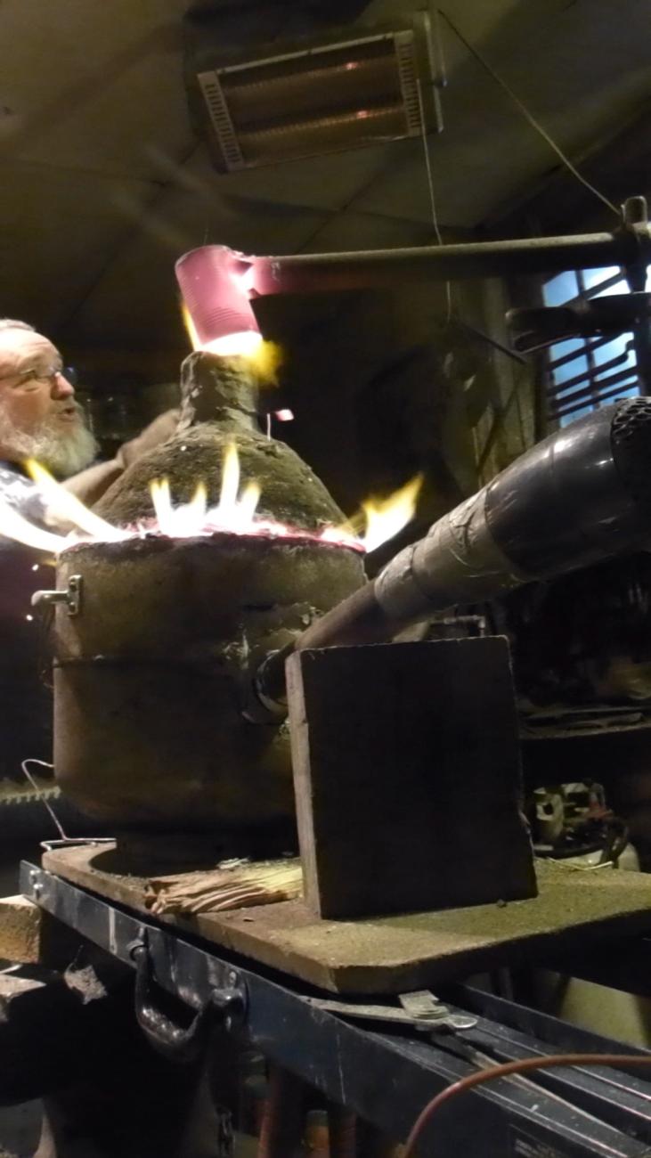 Before the pilot run could be accomplished a number of preparatory steps were required. The furnace was constructed by cutting open a propane tank. The top was removed, an opening for a tuyere was cut leaving room so that in future experiments the angle of the tuyere could be easily adjusted, and two handles were bolted onto the frame. A cob mixture of high temperature clay, sand and horse manure was used to line the inside of the furnace with a wall thickness of 2-3 cm. Cob and the high temperature clay were deliberately chosen to increase the durability of the body, and the top was built out of the same material.