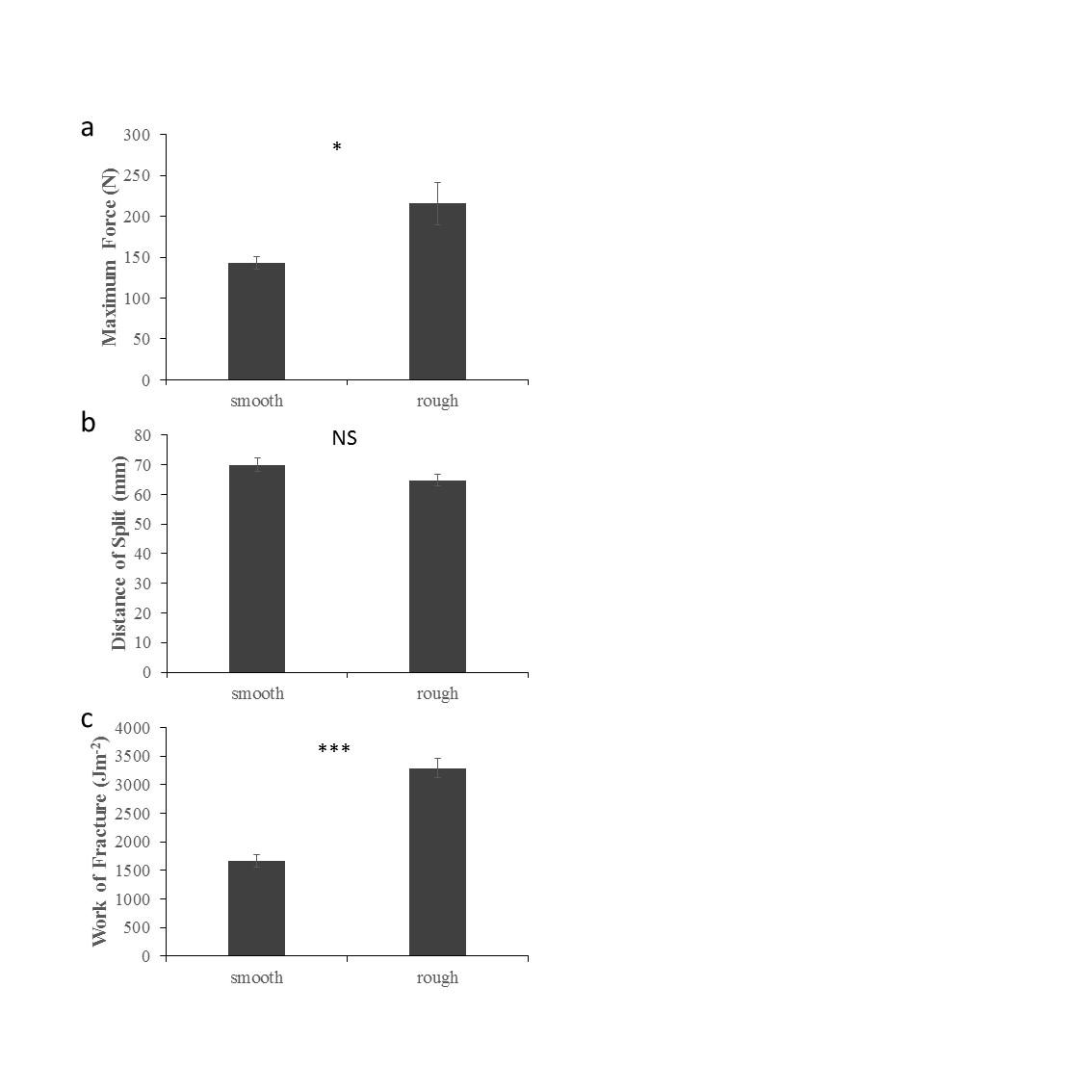Roughness had no noticeable effect on the shapes of the force displacement curves or the distance the cracks were driven. However, an independent sample t test showed that it did have significant effects on both the maximum force and energy required per unit area to split coppice (See Figure 10). Rougher blades required a 50% higher maximum force (t(18) = 2.67, p = 0.016) and used 98% more energy per unit area (t(18) = 8.10, p < 0.0005).
