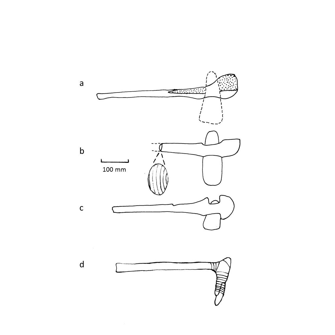 Firstly, one of the main problems of axe handles which are cut with tenons to hold the blade is that they are prone to splitting along their length (See Figure 11a-c). One main finding of our previous research on the tangential properties of wood is that it has a higher work of fracture against tangential splitting than radial splitting (Ăzden and Ennos 2014; Ăzden, Ennos and Cattaneo, 2017). In modern axes the handles are carved so that the growth rings are parallel to the blade of the axe (Bealer, 1996). Consequently, when the distal end is notched and a wedge inserted to open it out and grip the blade, extension of the notch is resisted by the rays within the wood. In a similar way, Neolithic axes in which the handle is cut with a tenon to hold the blade would also be expected to be carved in the same way (See Figure 11b): with the tenons cut parallel to the growth rings.