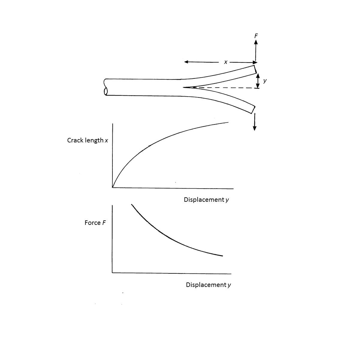 Consider the situation shown in Figure 2a, in which a crack has been started down the centreline at the distal end of a coppice pole, and the two ends are being pulled apart. A force, F, is needed to bend the two ends and to drive the crack forward through the pole. The distance down the pole, x, and the crack is driven for a given displacement, y, of each half is best determined by considering the energy expended. The further the crack extends (and hence the higher value of x), the greater the energy required to split the wood and create two new fracture surfaces. However, the further the crack extends, the smaller would be the force needed to bend the two halves and the less elastic energy would be stored within them. Typically, material deforms in the way in which energy expenditure is minimised, therefore the crack will extend until the sum of these two forms of energy is minimised. The stored elastic energy in the bent halves is progressively used to open the crack as the two halves are pulled apart.