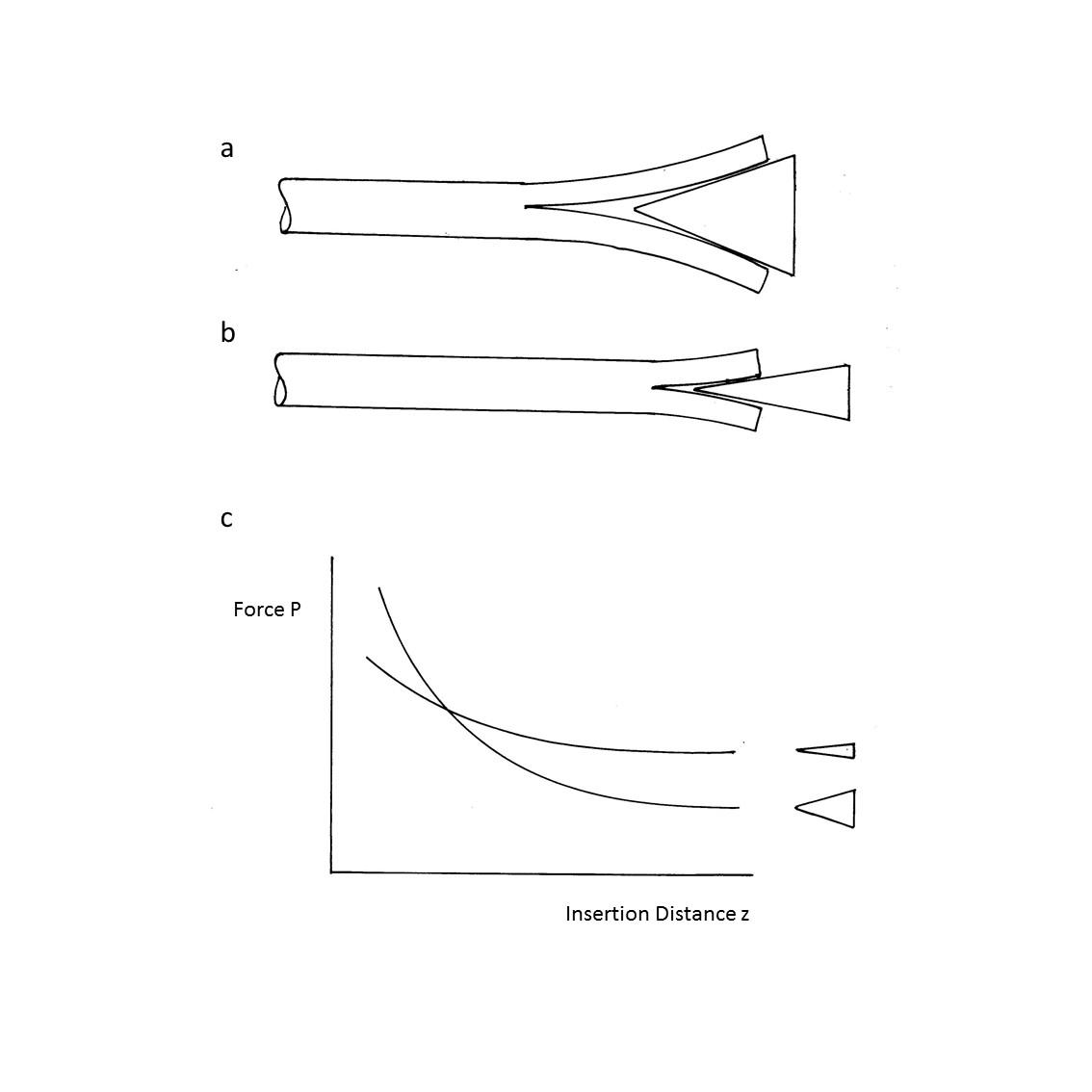 So that the greater the angle, Ξ , of the wedge, the further it can be inserted before the arms lie flat and the force stops falling (See Figure 4a-c). Note that the greater the angle of the wedge, Ξ , the lower the force P to continue opening the crack, because the point at which the arm touches the wedge will be further from the crack tip; the restoring force F will therefore be lower and consequently so will the friction G resisting the movement of the wedge. Therefore, wider wedges will initially be harder to insert but after a time become easier (See Figure 4c).